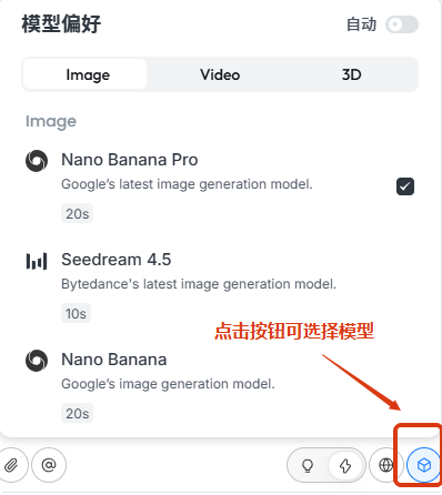 2.模型选择是战略:在对话框中可以指定模型。Nano Banana Pro 是修图和确保一致的王者,适合以产品/人物为核心的二次创作;Seedream 4 擅长一次性生成高质量、有排版感的海报。