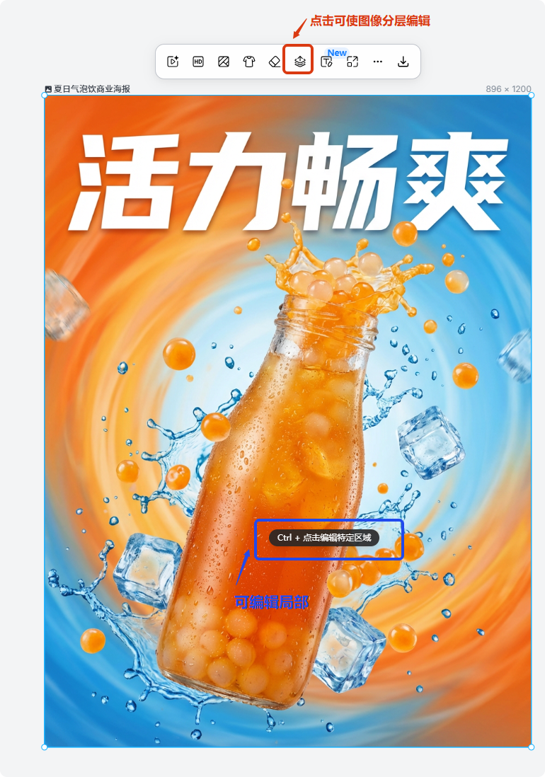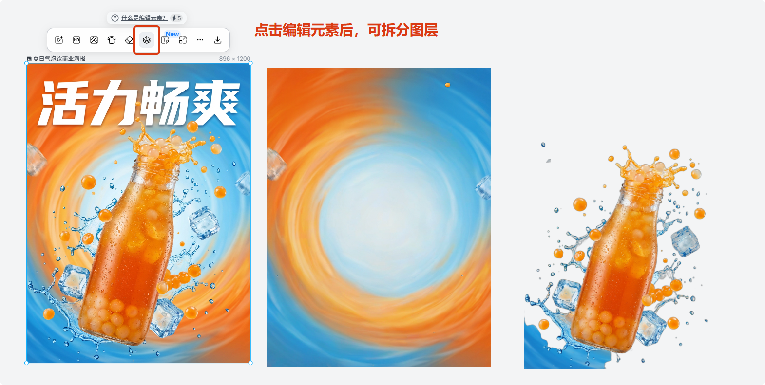 💡编辑元素:点击该按钮后,AI会将图片智能拆分为文字、主体、背景等可编辑图层,这意味着可以有以下功能: