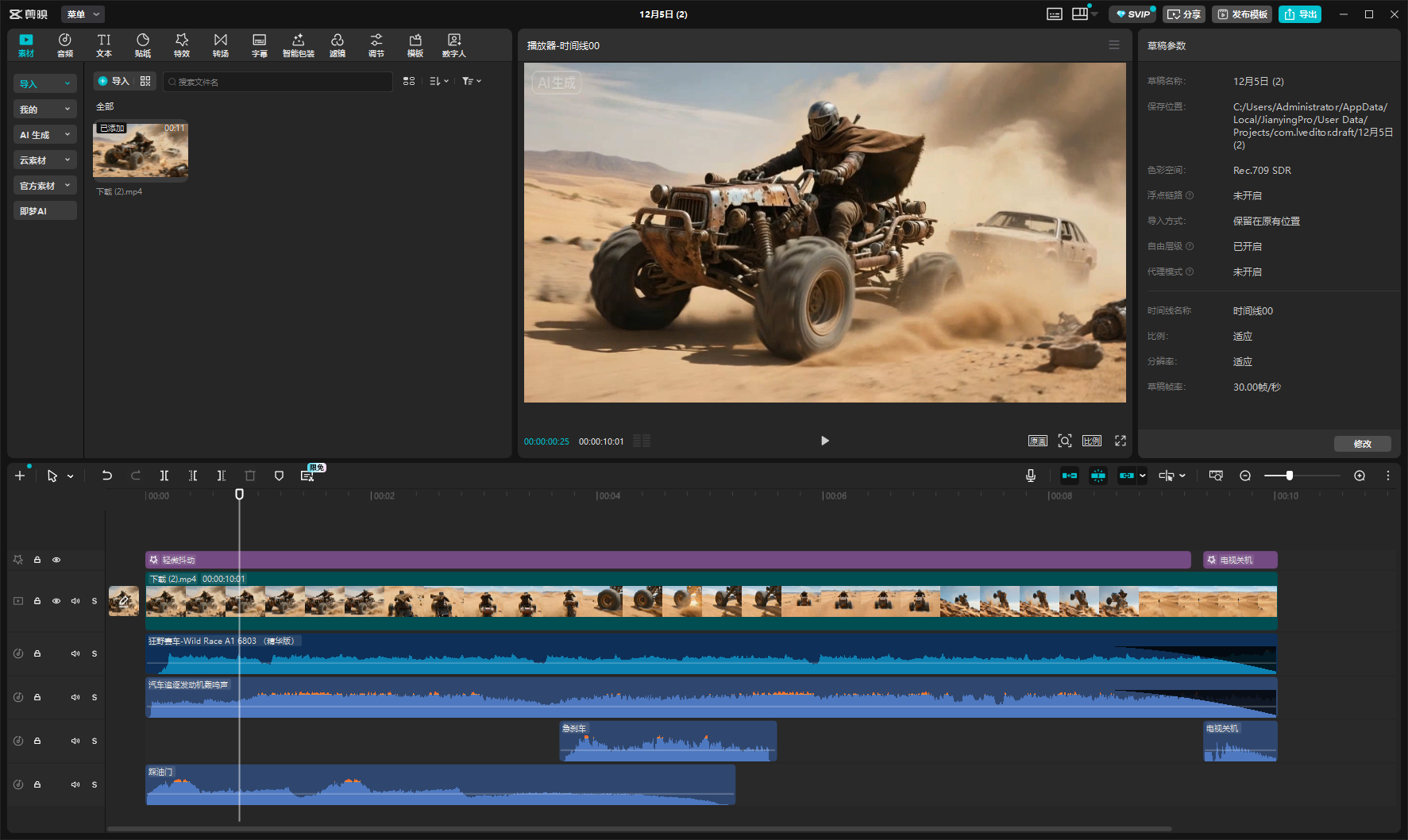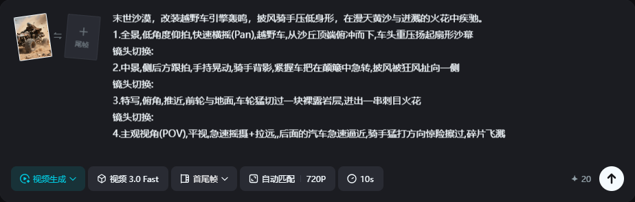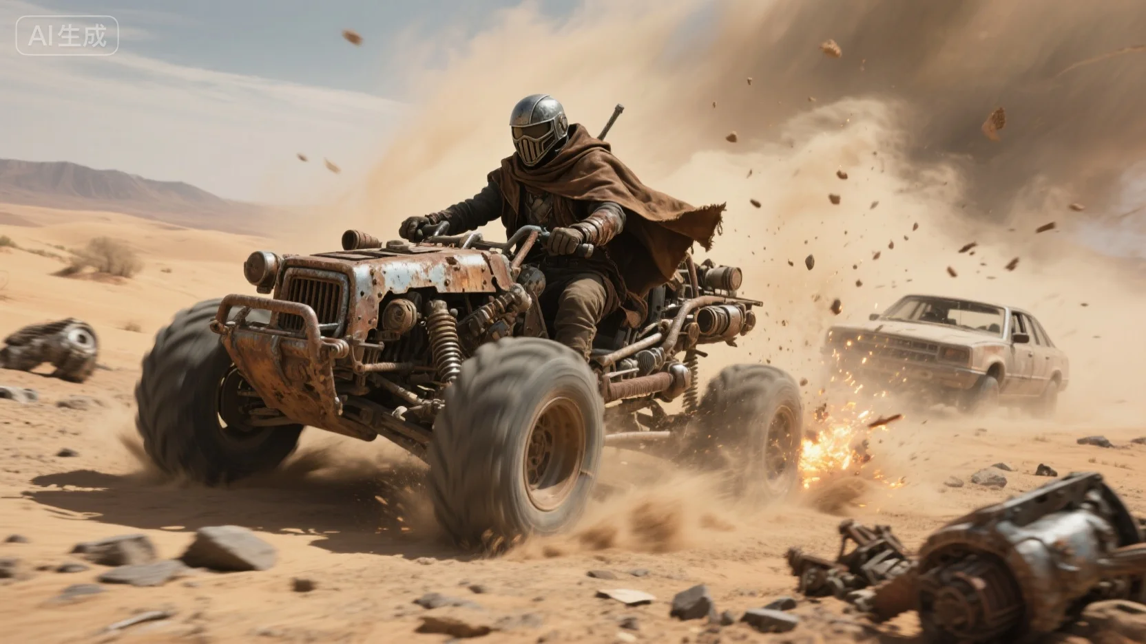 末世沙漠,改装越野车引擎轰鸣,披风骑手压低身形,在漫天黄沙与迸溅的火花中疾驰。 1.全景,低角度仰拍,快速横摇(Pan),越野车,从沙丘顶端俯冲而下,车头重压扬起扇形沙幕 镜头切换: 2.中景,侧后方跟拍,手持晃动,骑手背影,紧握车把在颠簸中急转,披风被狂风扯向一侧 镜头切换: 3.特写,俯角,推近,前轮与地面,车轮猛切过一块裸露岩层,迸出一串刺目火花 镜头切换: 4.主观视角(POV),平视,急速摇摄+拉远,前方破车,车身急速逼近,骑手猛打方向惊险擦过,碎片飞溅 镜头切换: 5.中景,正面略仰,固定,整车与骑手,冲上斜坡短暂腾空,沙尘如瀑布从车底泻下,背景是辽阔沙漠 镜头切换: 6.远景,平视,缓慢拉远(DollyOut),车辆与沙尘轨迹,变成地平线上一个小点,驶向更深的荒漠,只余烟尘缓缓沉降