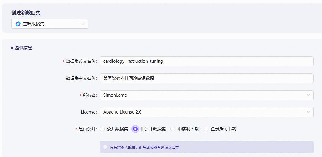 cardiology_instruction_tuning。 License:如果是私有数据,随便选一个即可。 可见性:一定要选择“非公开”。这样除了你授权的账号,没人能看到这些数据。