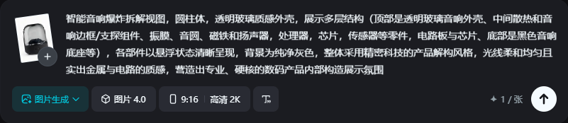 2.回到即梦AI图片生成功能,上传第一步做好的白底音响图作为参考图,输入拆解效果提示词,