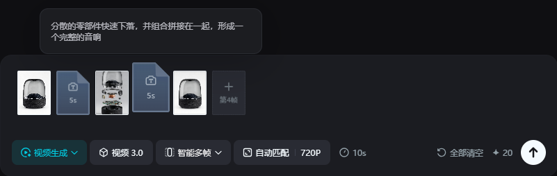 2.上传三张图作为关键帧:首帧和尾帧都用第一步的白底完整音响图,中间关键帧用第二步的爆炸分解图