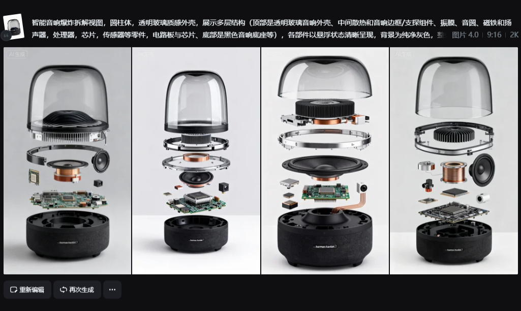 前期构思:先明确爆炸分解的呈现逻辑,比如智能音响可按 “从上到下”(顶部音响网罩→中层散热组件→核心发声部件→底层电路板)的顺序拆解,提前规划好各部件的悬浮距离和展示角度,避免生成的特效杂乱无章。