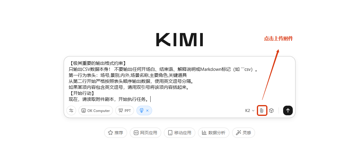 在Kimi对话框的文件上传区,上传你的TXT/PDF剧本。