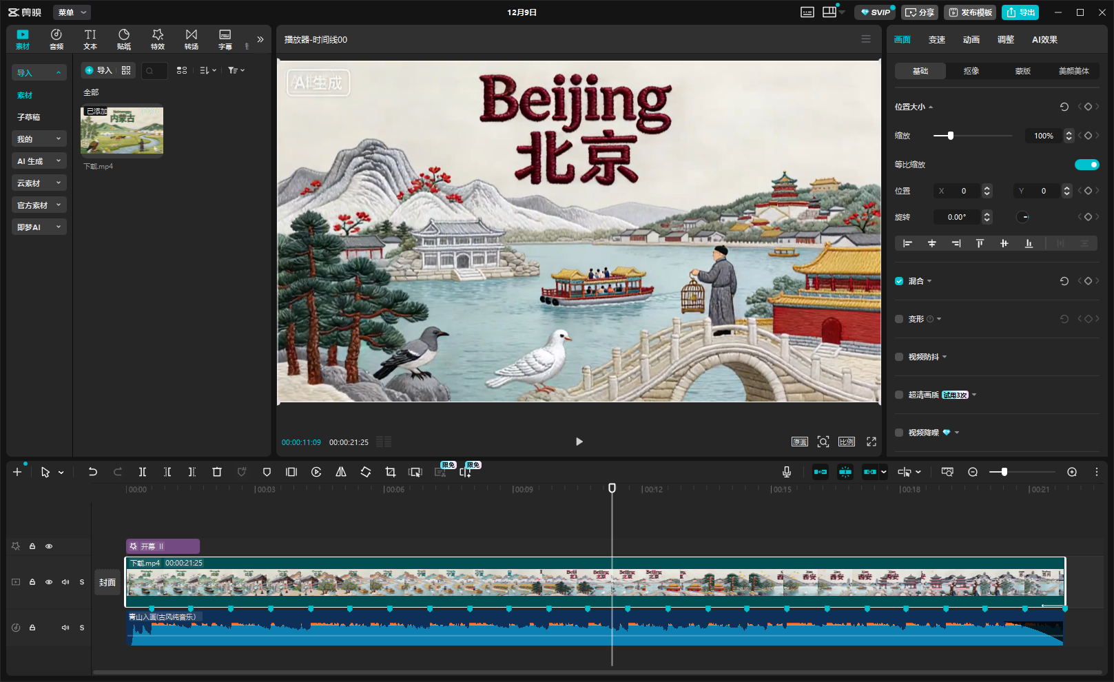 2.添加背景音乐/开幕转场:选轻柔的古风纯音乐,比如古筝、竹笛曲目,再添加一个开幕转场特效即可