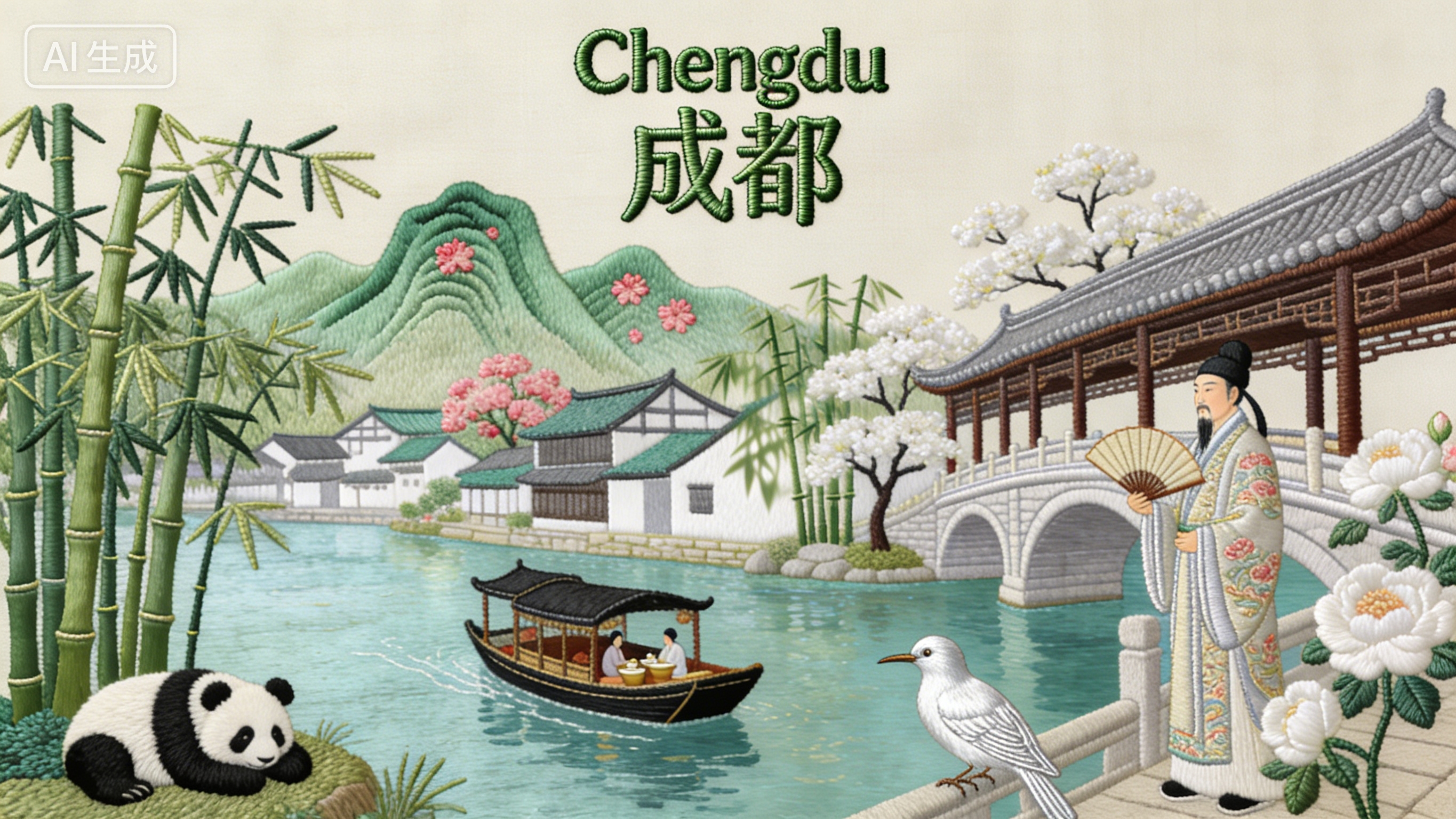 镜头右向匀速平移运镜,全景呈现成都刺绣海报场景,镜头右移时,“Chengdu 成都” 刺绣文字从右侧自然跳进,其纹理质感与画面的刺绣针脚风格完全融合。平移过程中,竹林里的熊猫慵懒抬爪、乌篷船上品茶人的闲适姿态、廊桥持扇文人的轻摇折扇动作、川西民居的青瓦白墙轮廓等细节自然呈现,与文字动态逻辑统一,画面丝滑过渡,营造富有韵律的成都风情视觉体验。