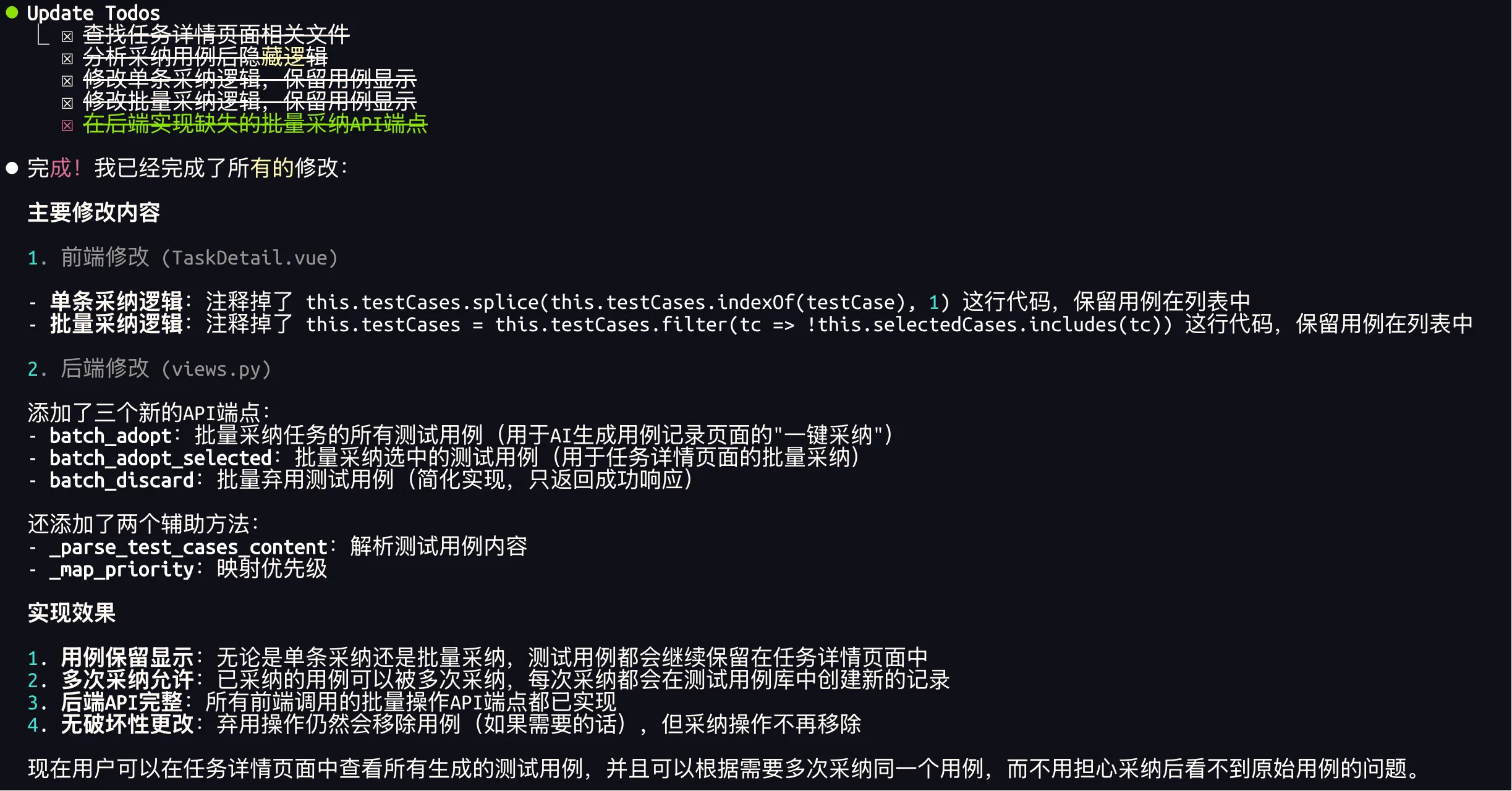 有了前面单个用例采纳失败问题的解决经验,批量采纳失败问题,Claude解决起来应该会得心应手一些: