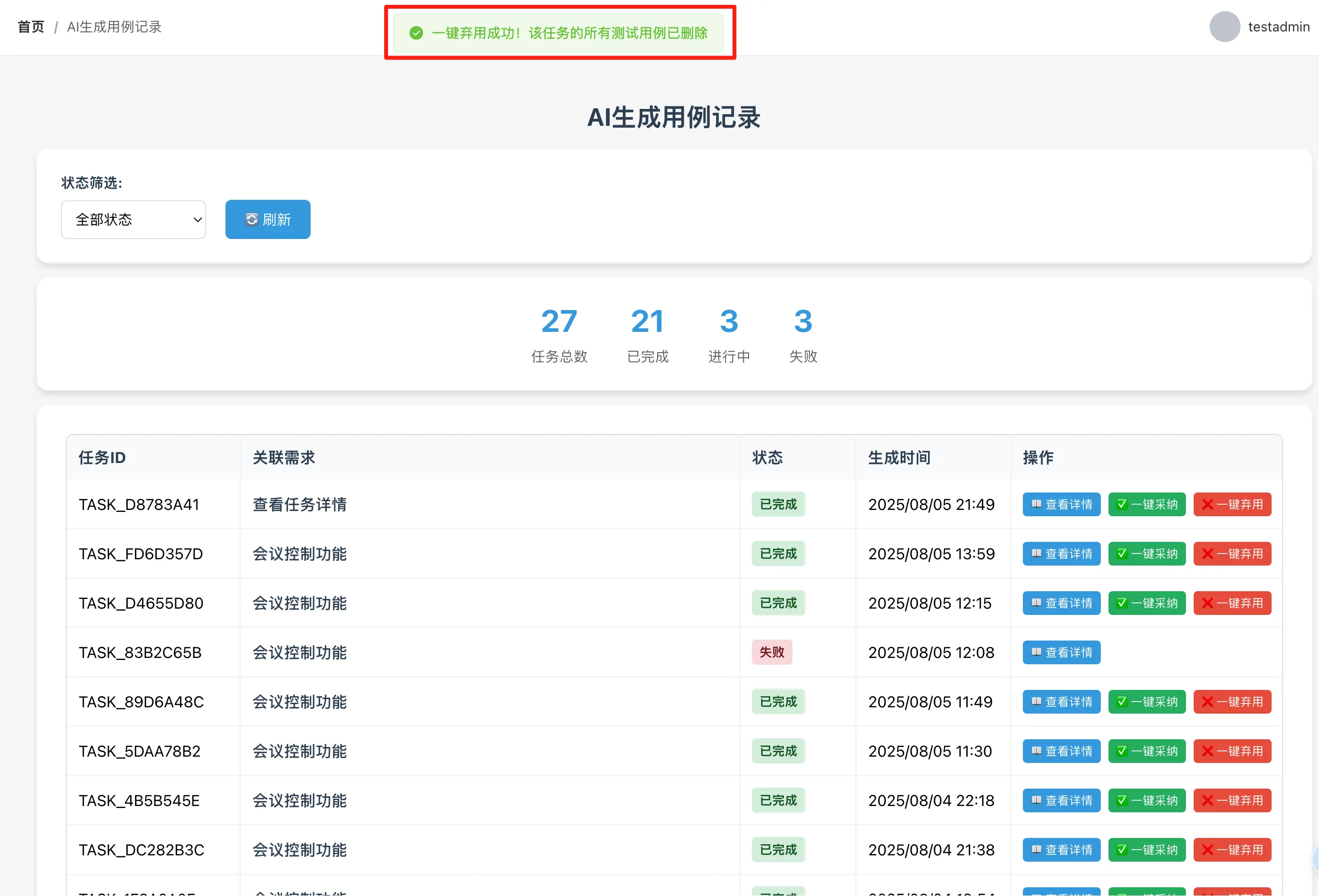 - 在AI生成用例记录列表中使用一键弃用功能后,该任务数据仍在列表中显示(这里应该是前面没有给出明确需求导致)