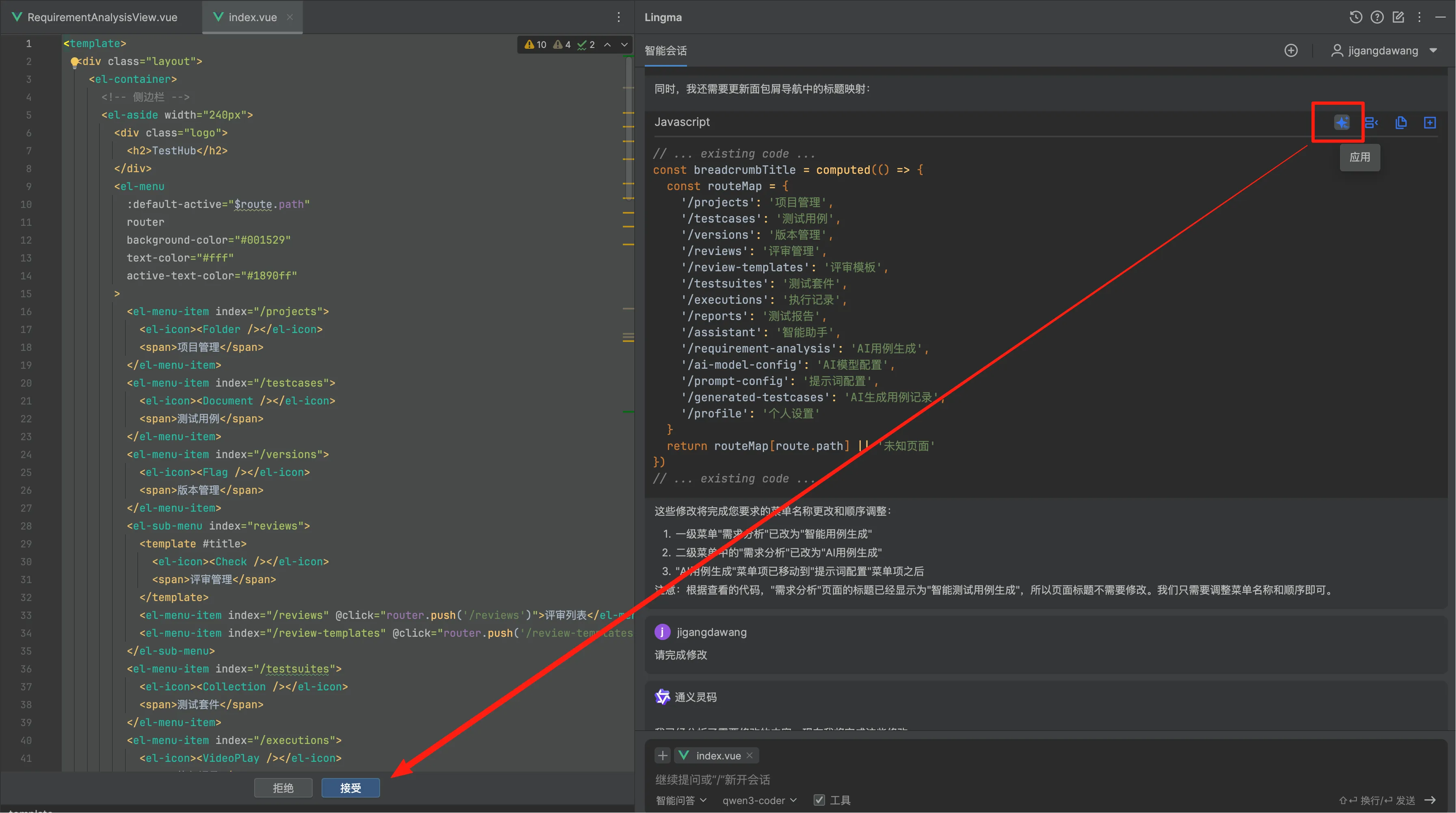 灵码也挺快的,首次使用,很快就熟悉了项目代码,找到要调整的位置,完成了“预修改”。之所以说是“预修改”,是因为灵码并没有像Claude那样,直接更新文件,也没有弹出人机交互的确认操作,还是需要人为主动地去操作变更:先点击“应用”,再“接受”。