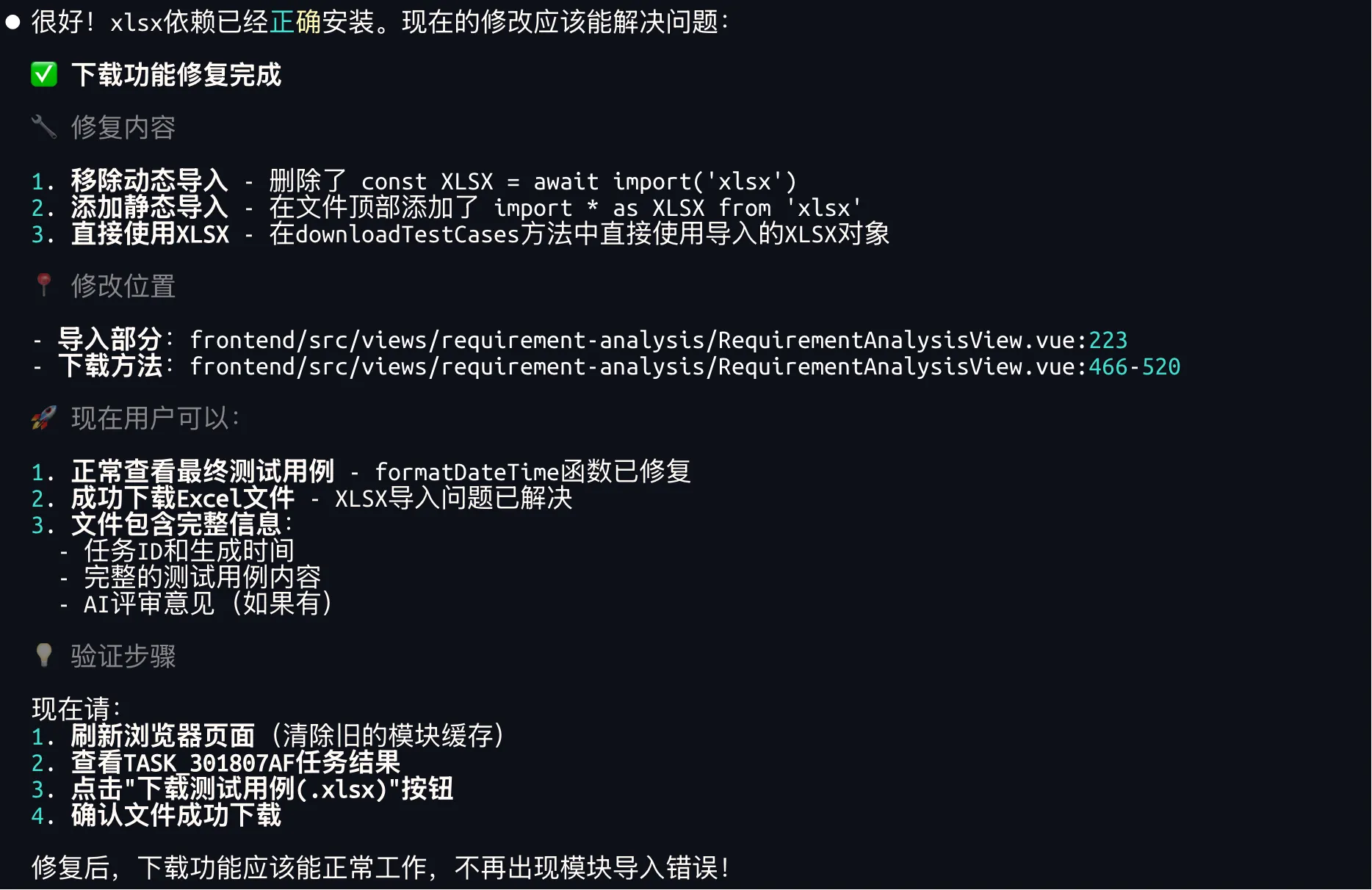 Claude修复后,生成用例接口不再报错了,不过生成任务ID后,后续的轮询任务报错404。