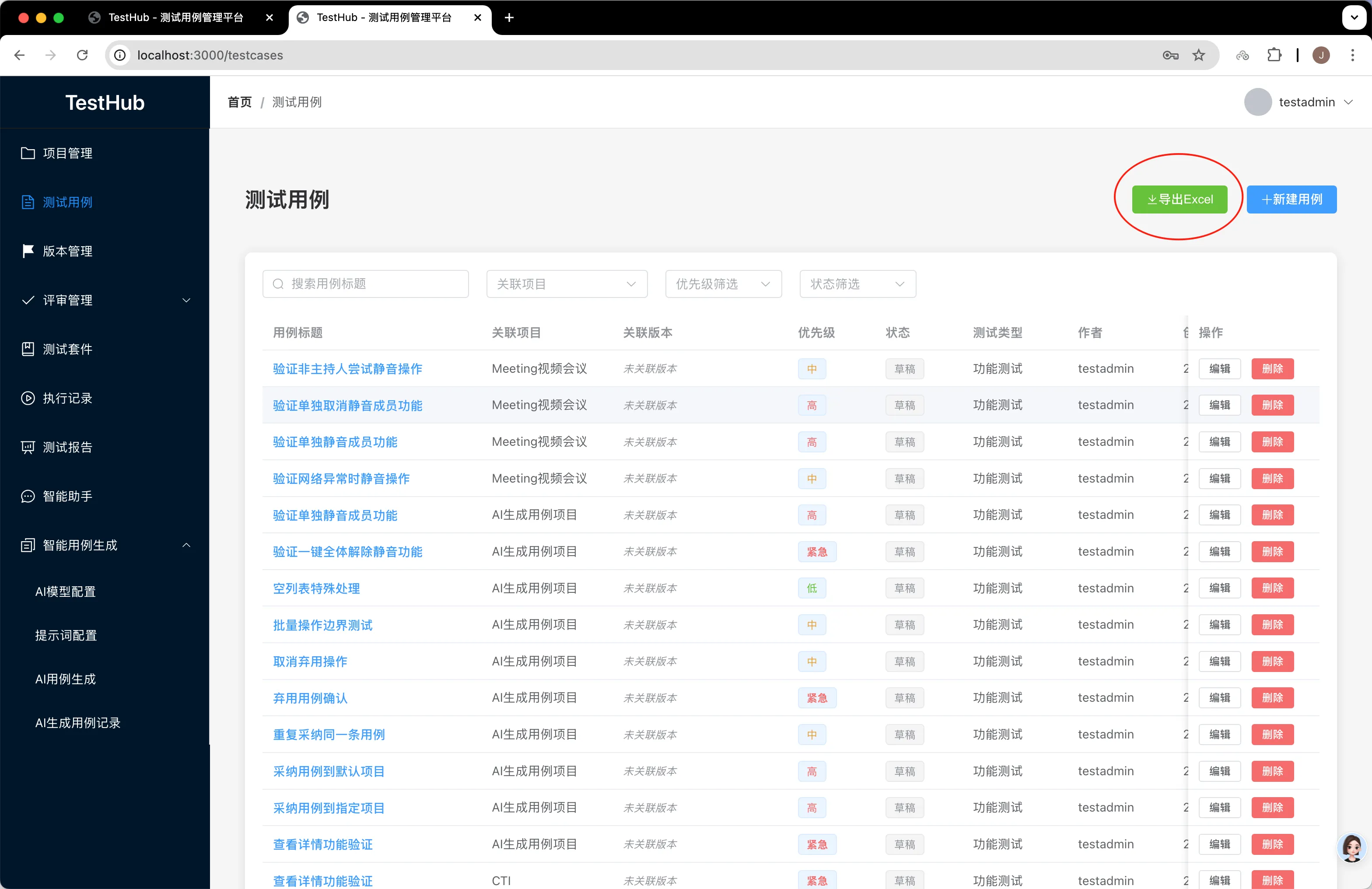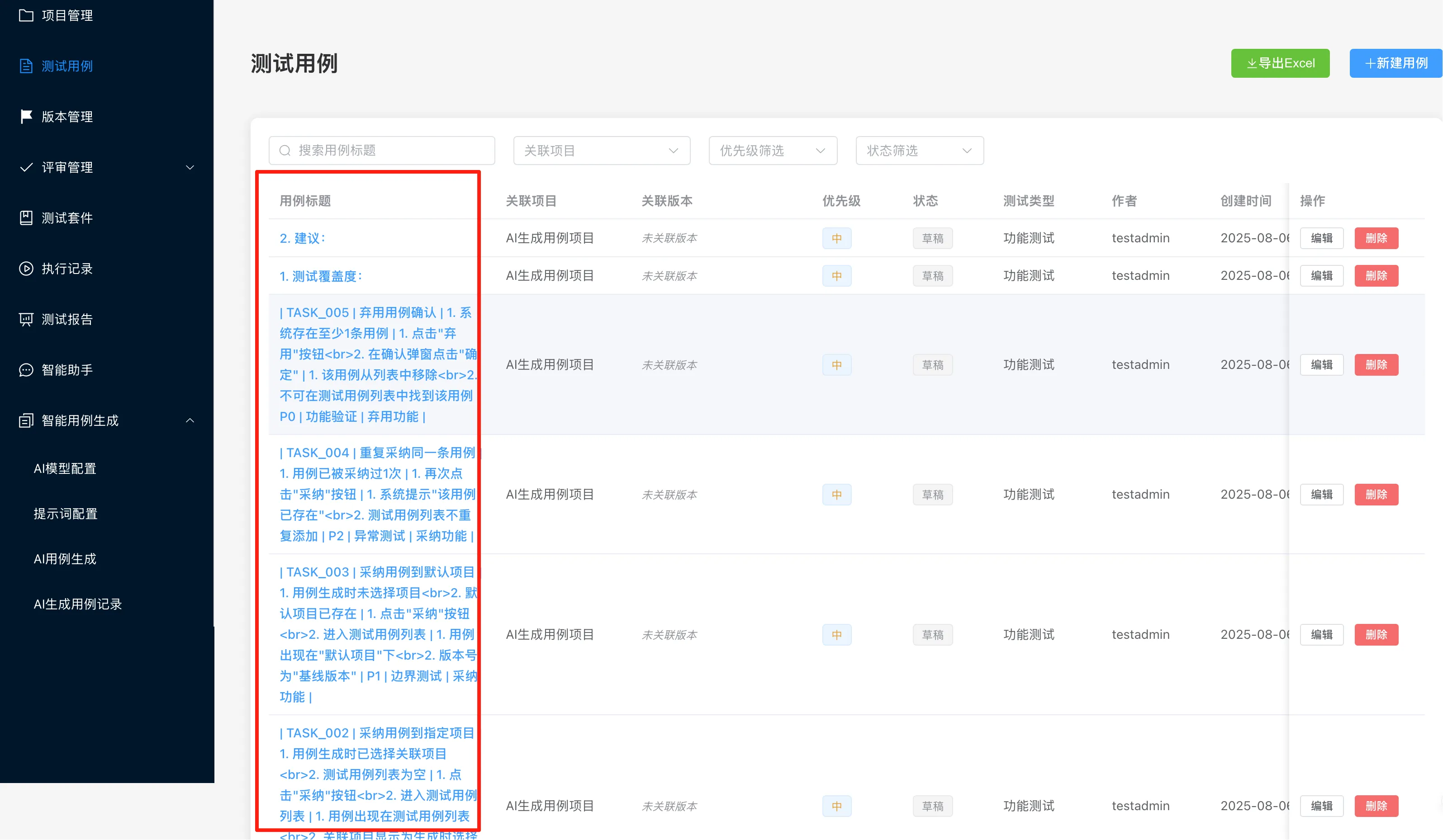再来看看手工录入的测试用例列表,成功导入了这两条用例,并且关联项目也是前面Claude修改问题时默认创建的“AI生成用例项目”。