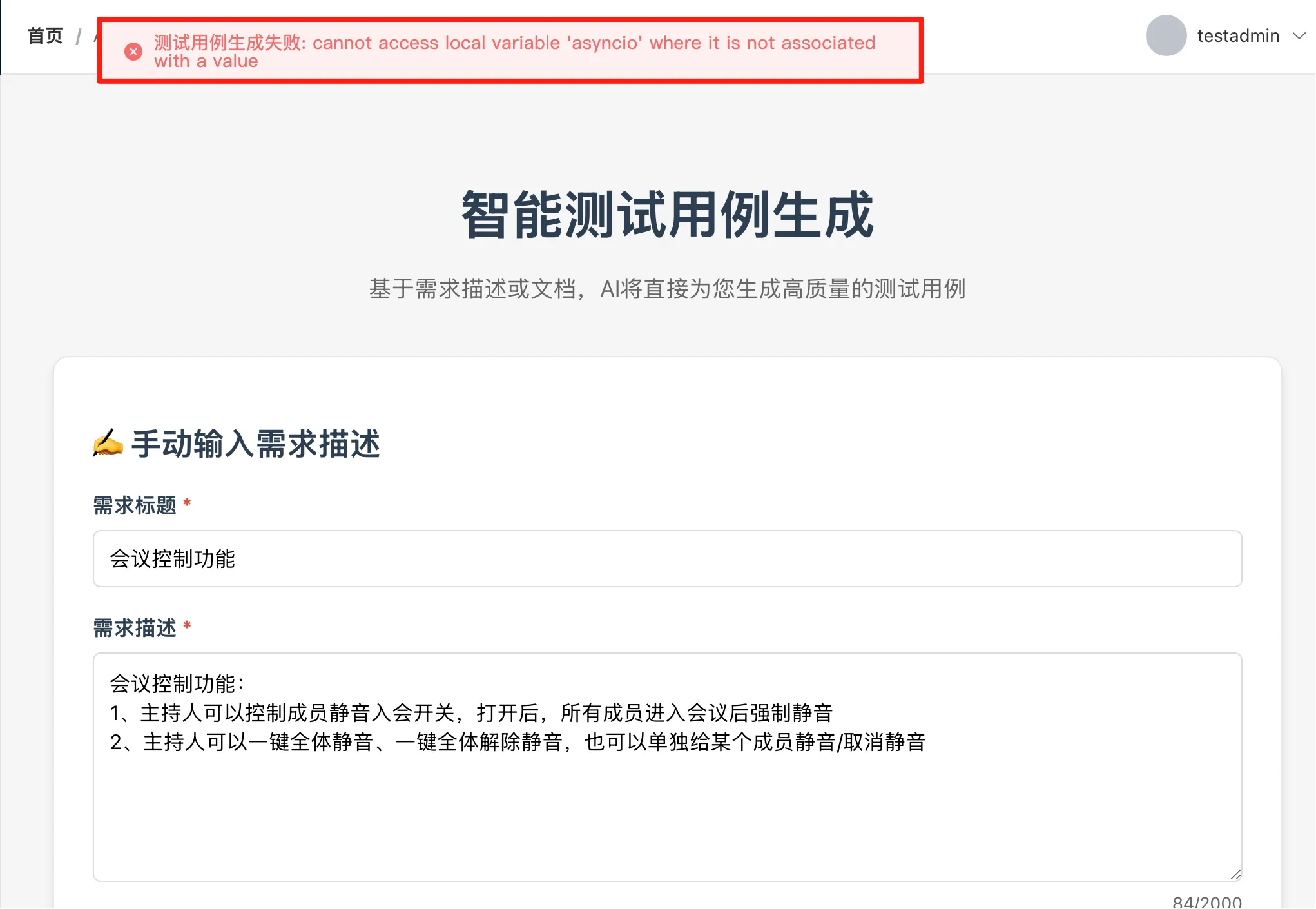 我手动输入了一些需求描述,提交生成测试用例。