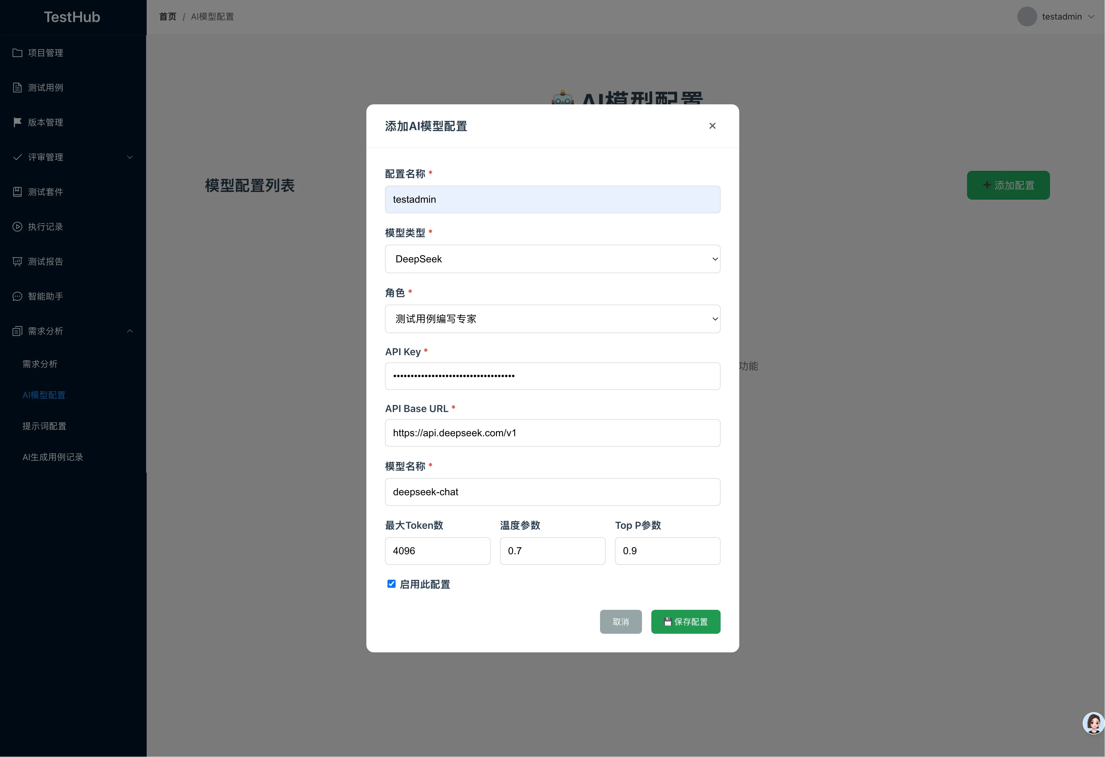 在需求分析菜单下单独编写一个页面“AI模型配置”,用于配置大模型,当用户填写有效的API Key保存后,后续编写和评审用例即可调用对应的大模型model参与工作