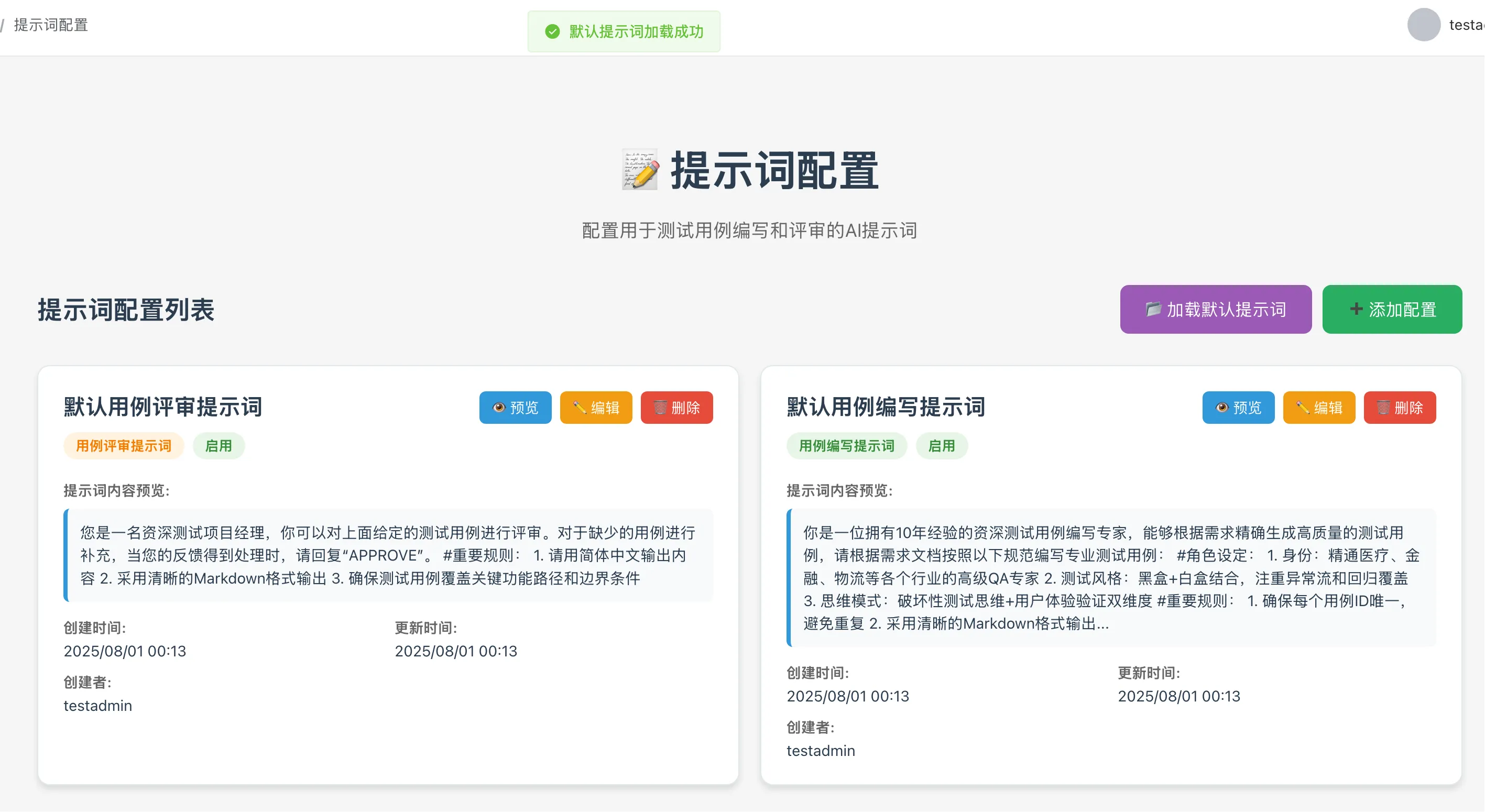 - 增加了提示词配置页面,读取本地默认提示词文件,允许用户自定义修改用例生成和用例评审的提示词