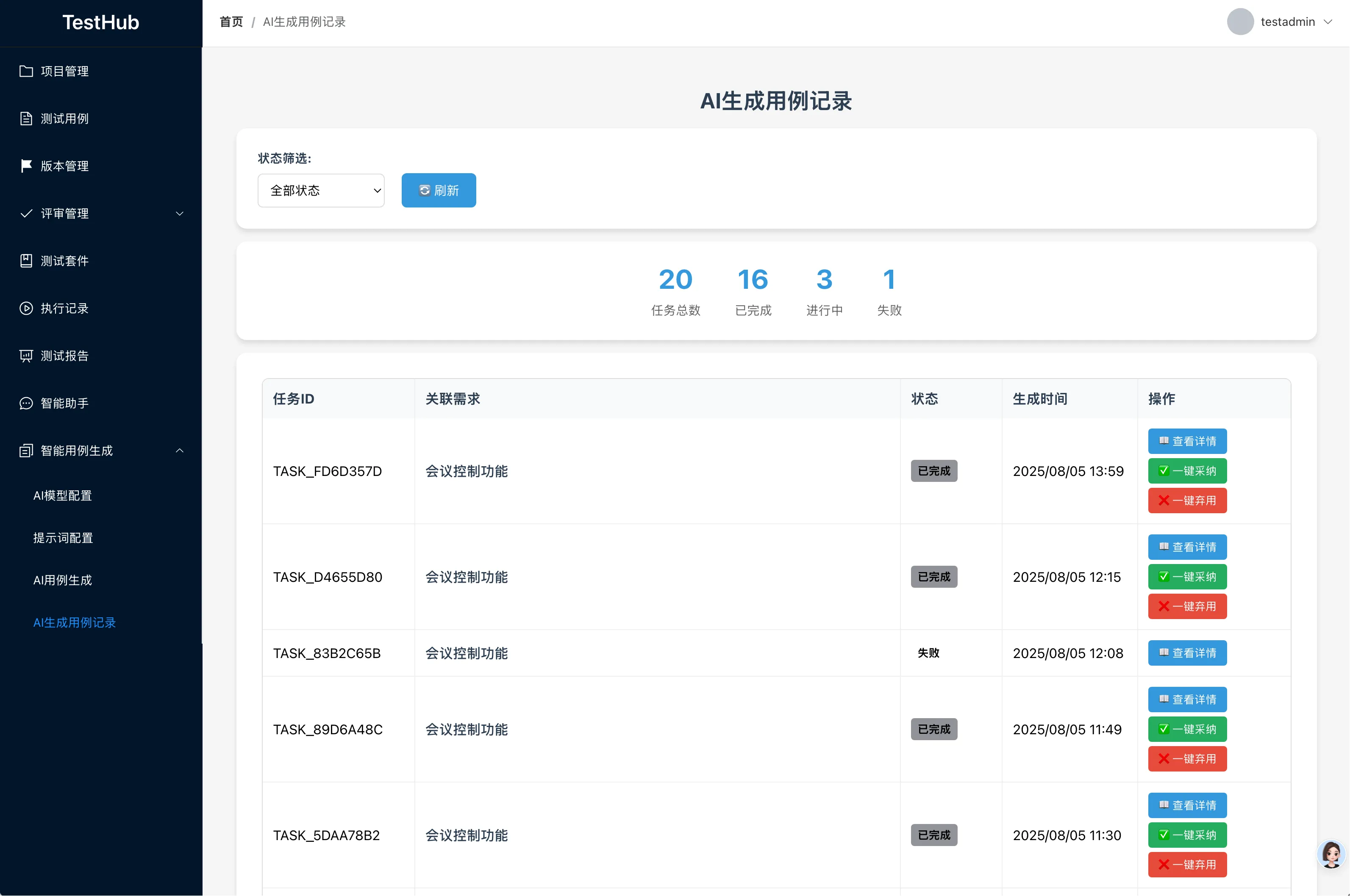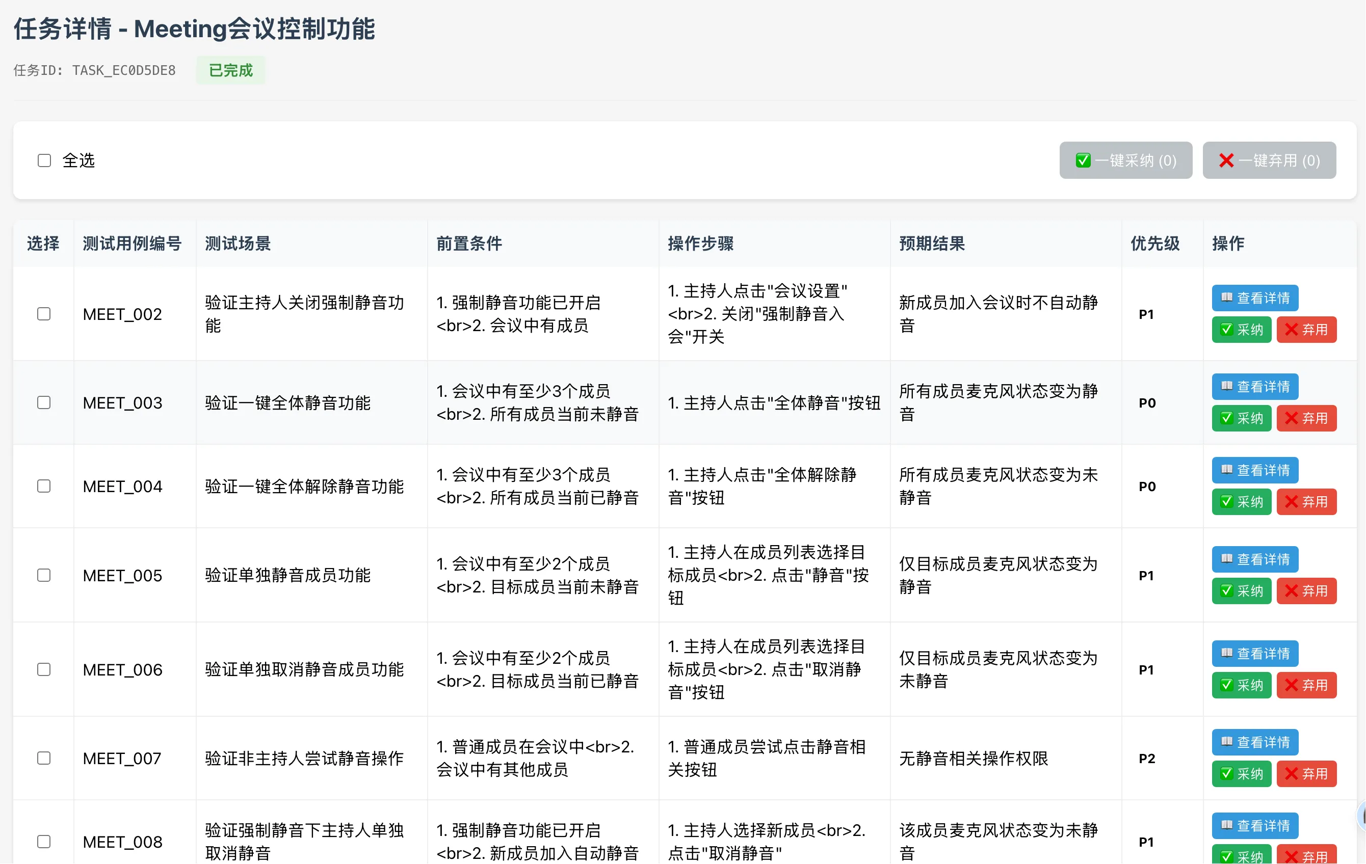 - 增加查看任务详情页面,支持单条、批量、全部采纳和弃用用例功能,一键导入到手动录入的测试用例列表