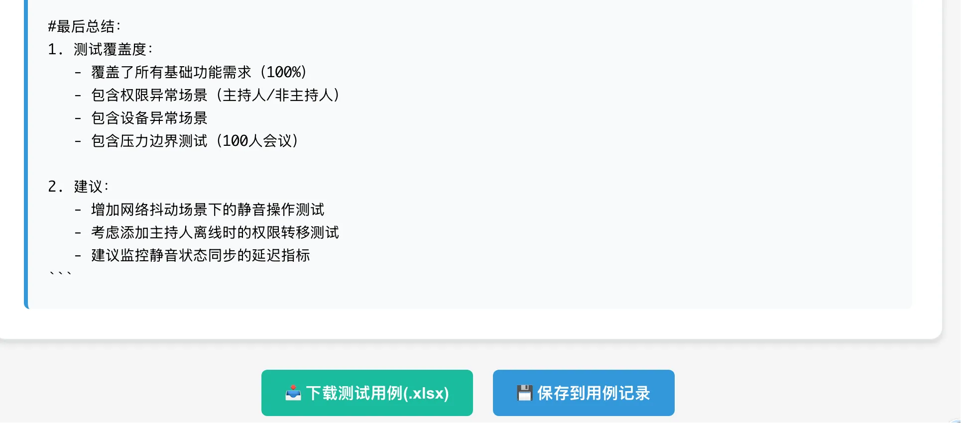 - 第二部分是“AI评审意见”,也就是调用Qwen大模型进行用例评审后给出的评审意见;