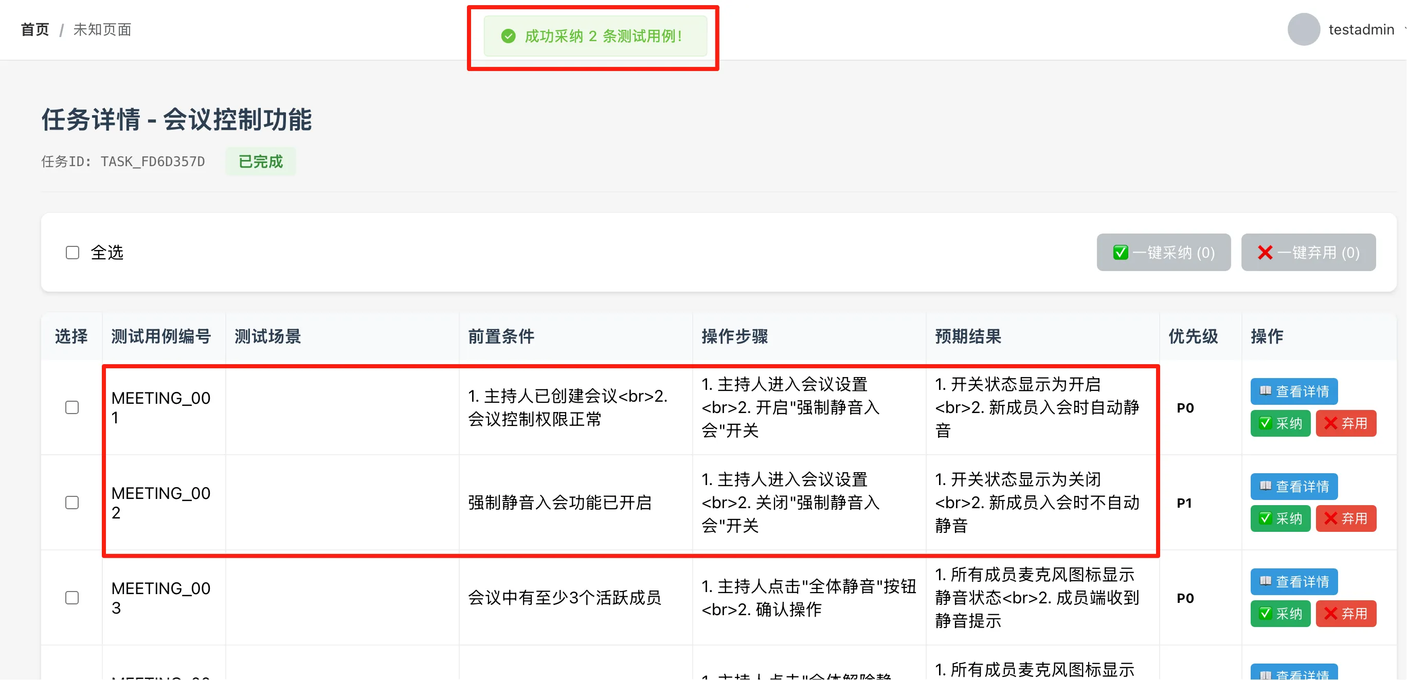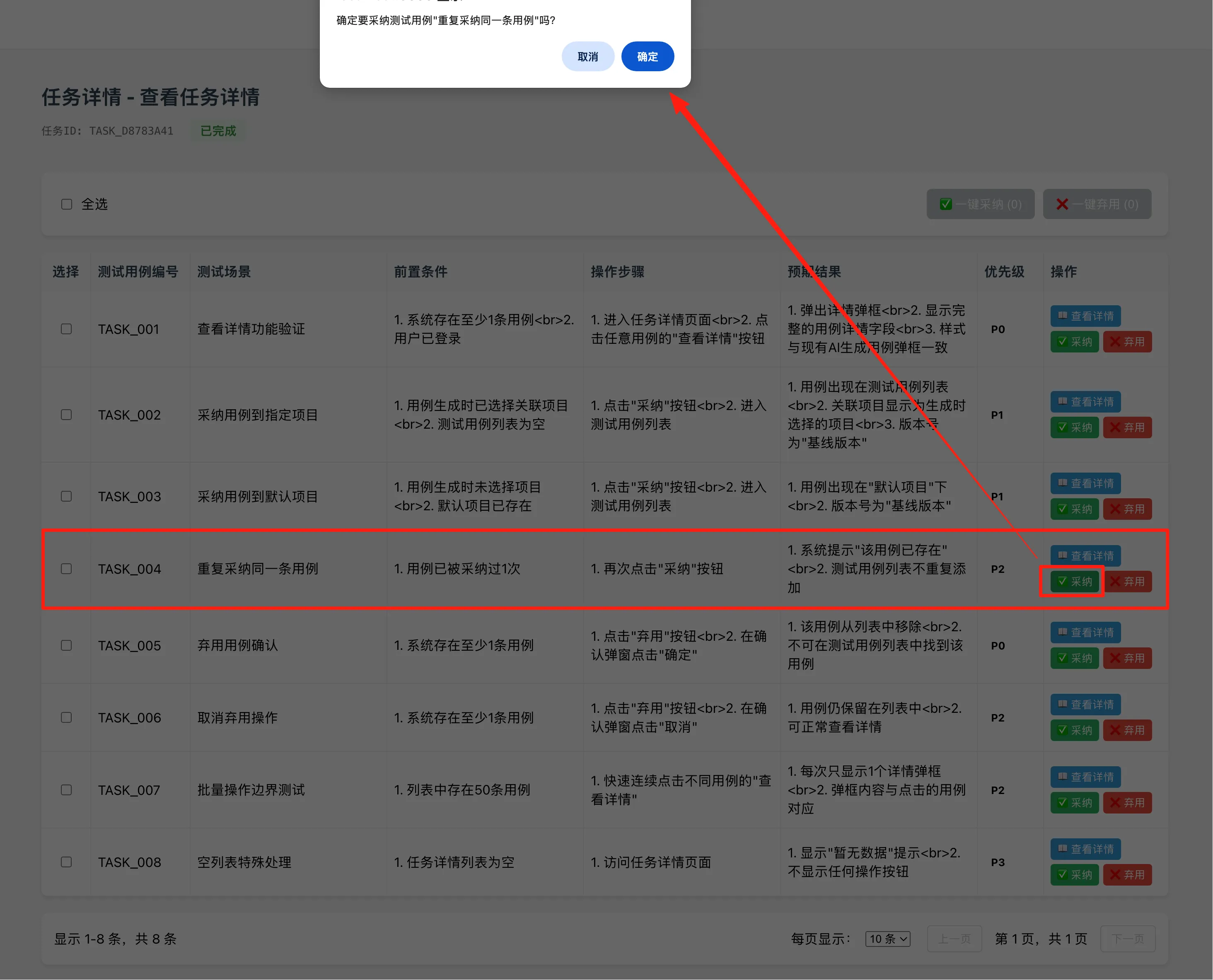 不过这里也存在一个问题就是:采纳用例后,该条用例数据在任务详情中就查看不到了。不知道是自动隐藏了还是删除了。前面我只是要求弃用后删除该条用例,并没有要求采纳后也删除该条用例。所以这里还是需要再调整下。