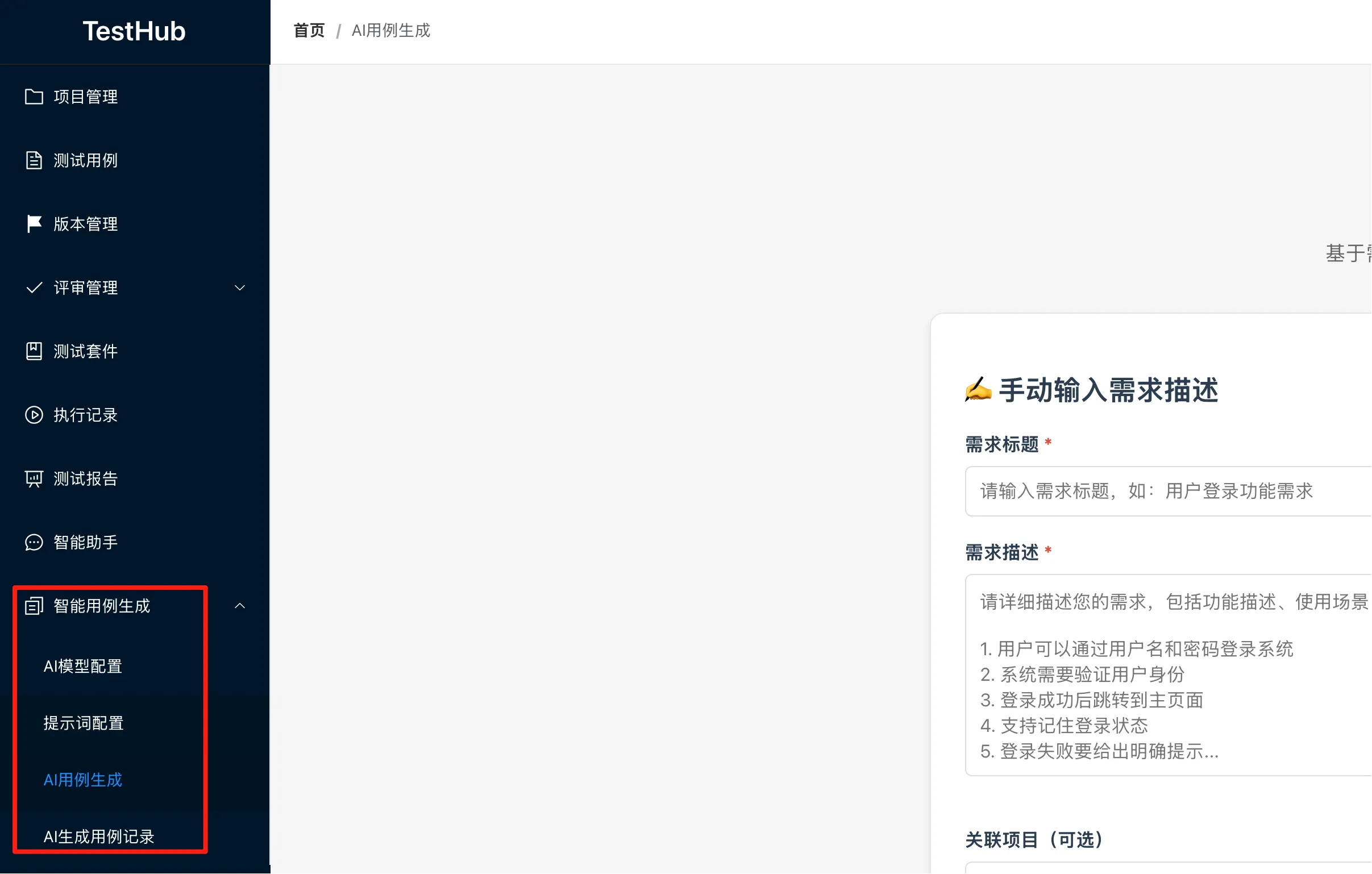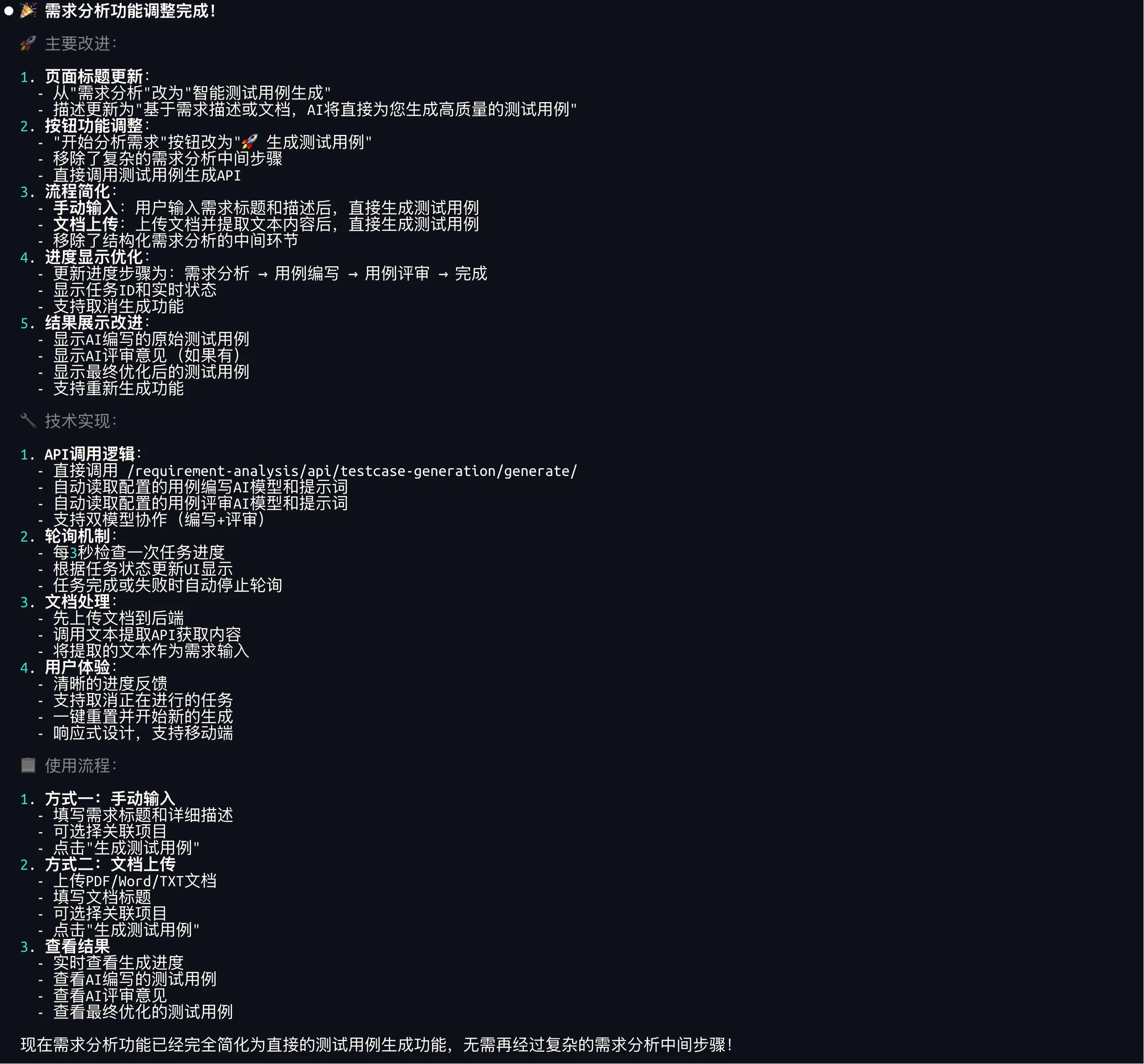 - 支持手动输入需求描述,支持上传TXT、Word、PDF格式的需求文件(既有功能保持不变)