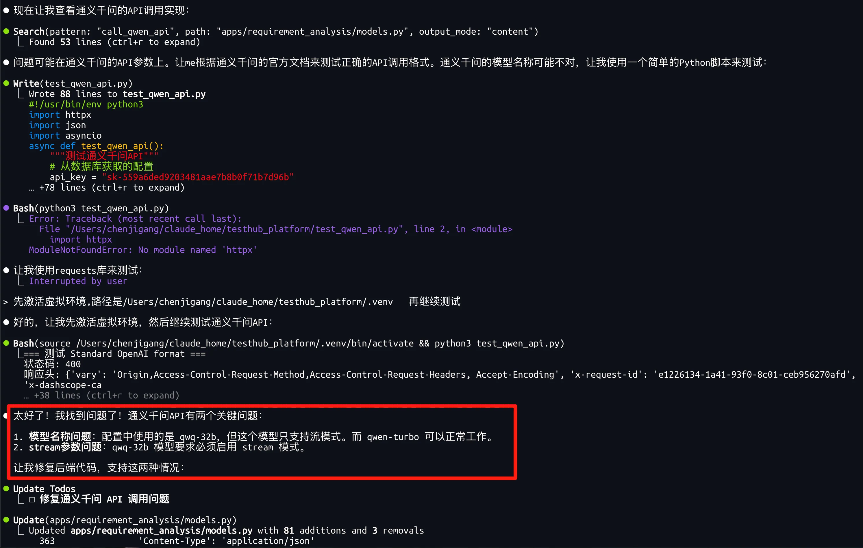 原来是我配置的“qwq-32b”模型只支持流模式,而代码中stream没有开启。Claude查原因、修复问题、测试验证一气呵成。