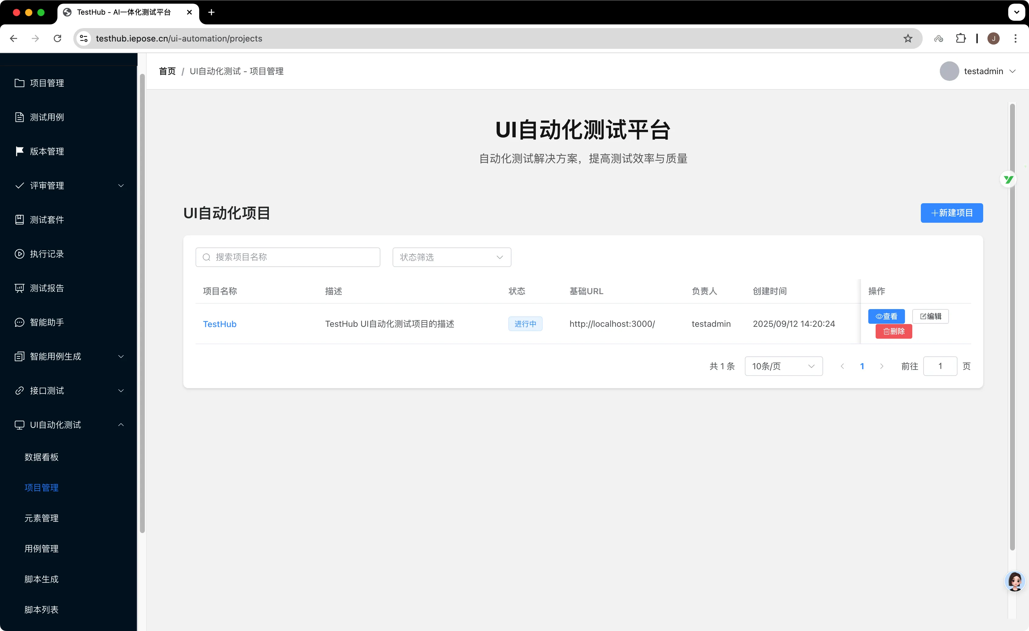 然后是项目管理,展示当前待测试的所有项目,也是整个模块下最大的单元结构。后面所有的用例、套件、脚本、报告都是基于项目开展的。
