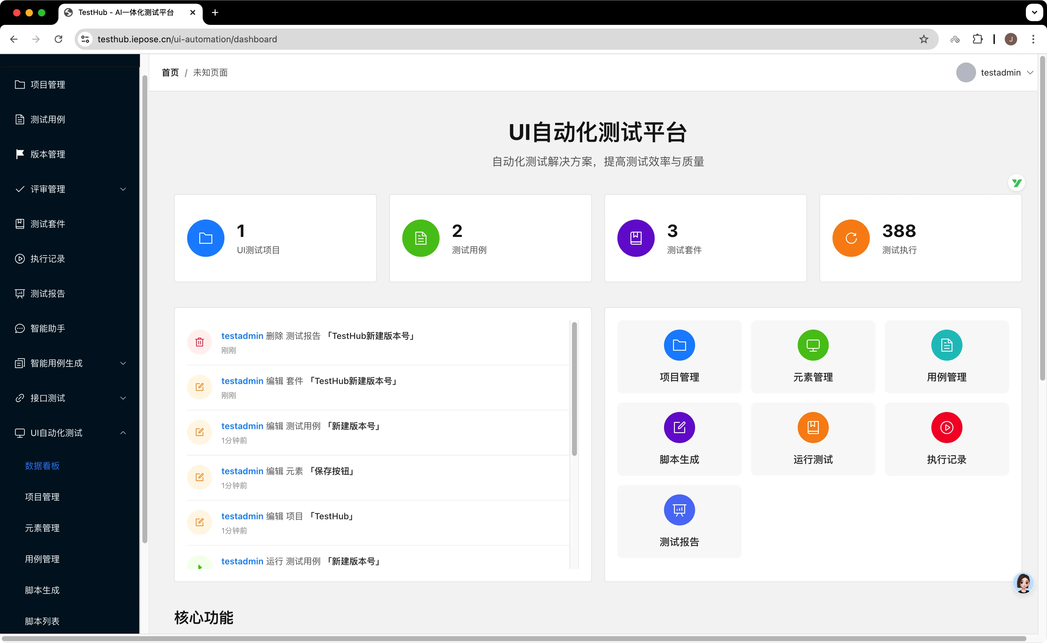 - 顶部展示项目、用例、测试套件、执行记录相关数据的统计;