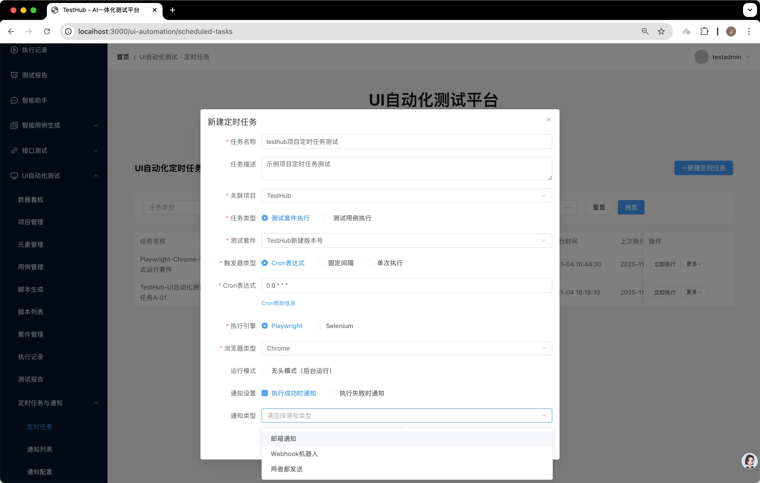 - 定时任务:支持多种触发器类型、任务类型和测试执行选项;
