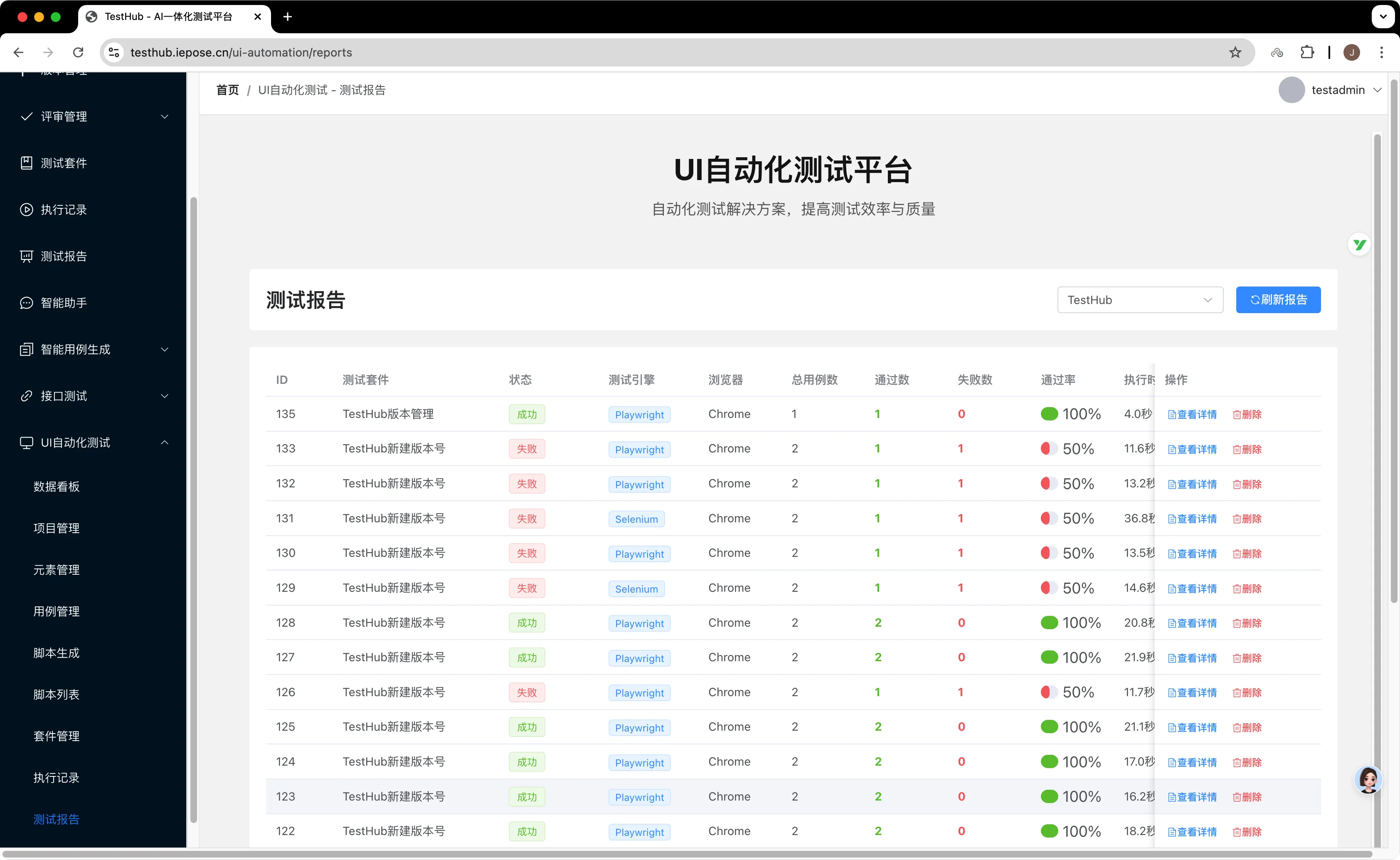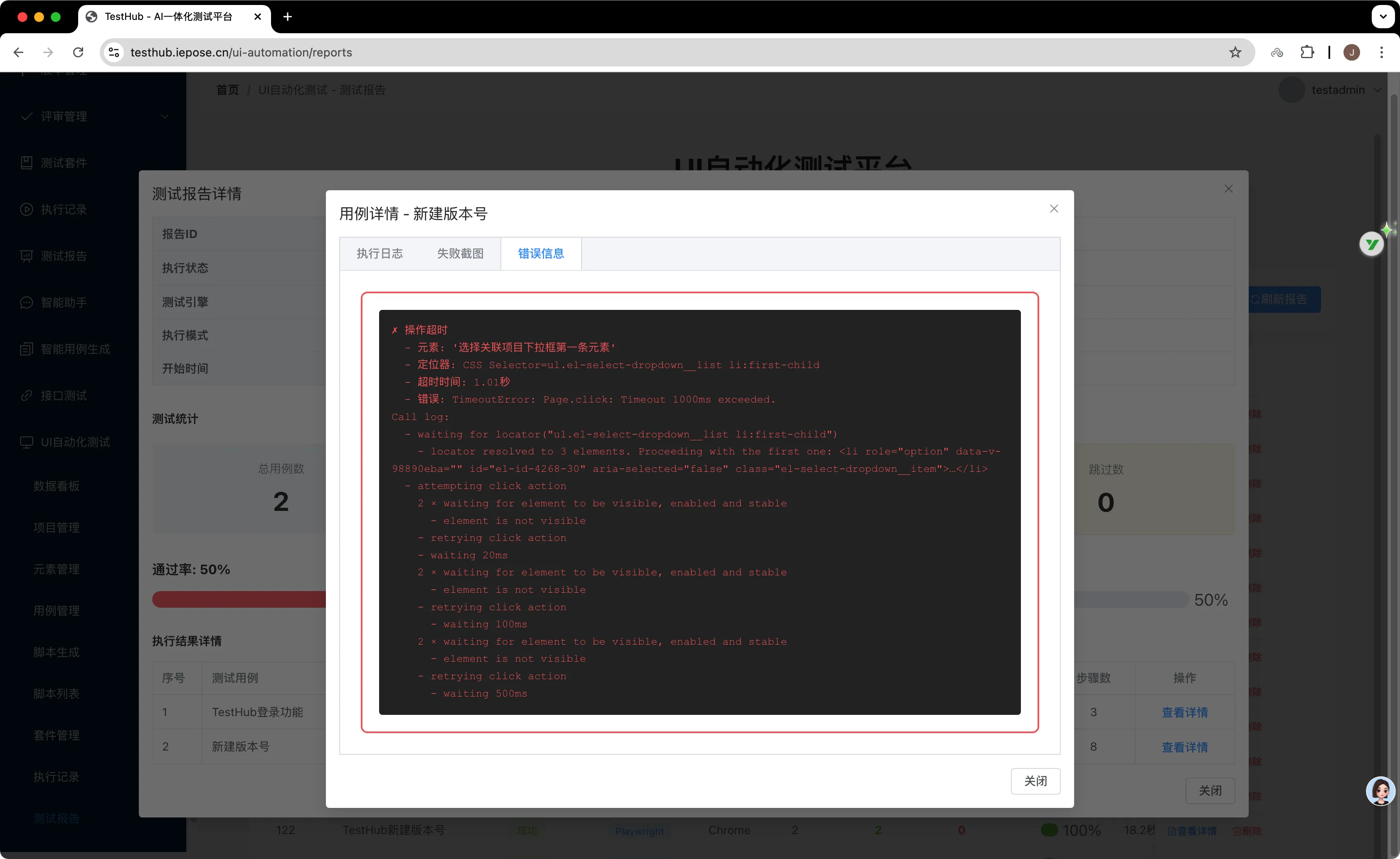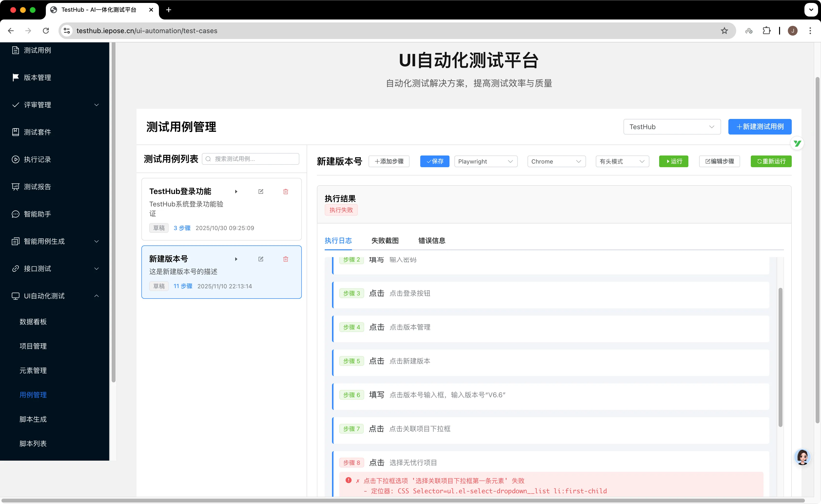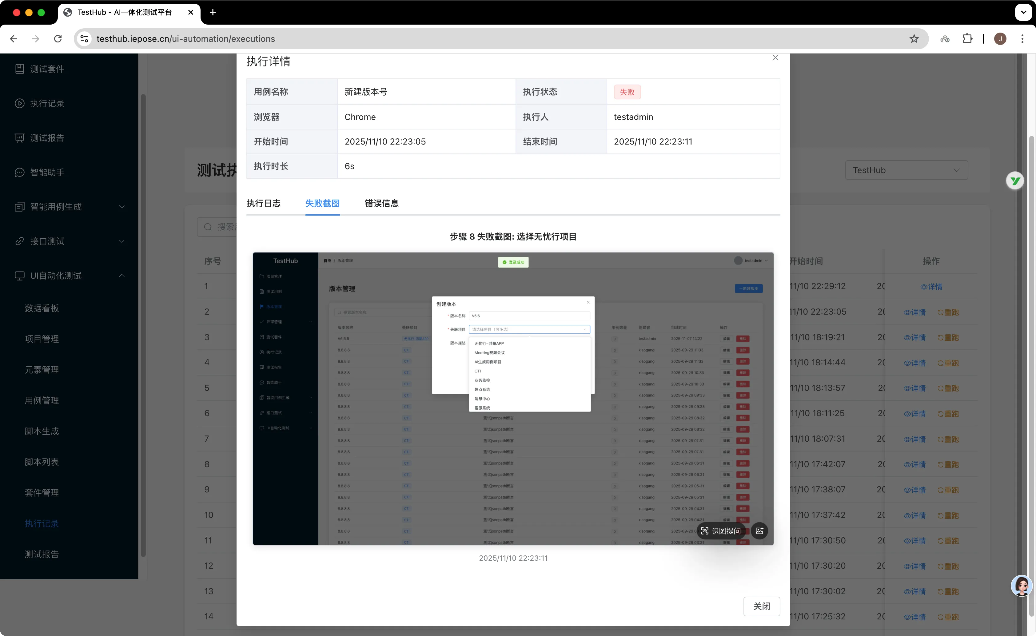 对于手动单独执行的测试用例和测试套件驱动执行的测试用例,均生成执行记录,有点类似前面开发的接口测试模块的“请求历史”。执行详情中展示具体的执行日志、失败截图、错误信息,支持一键重跑;