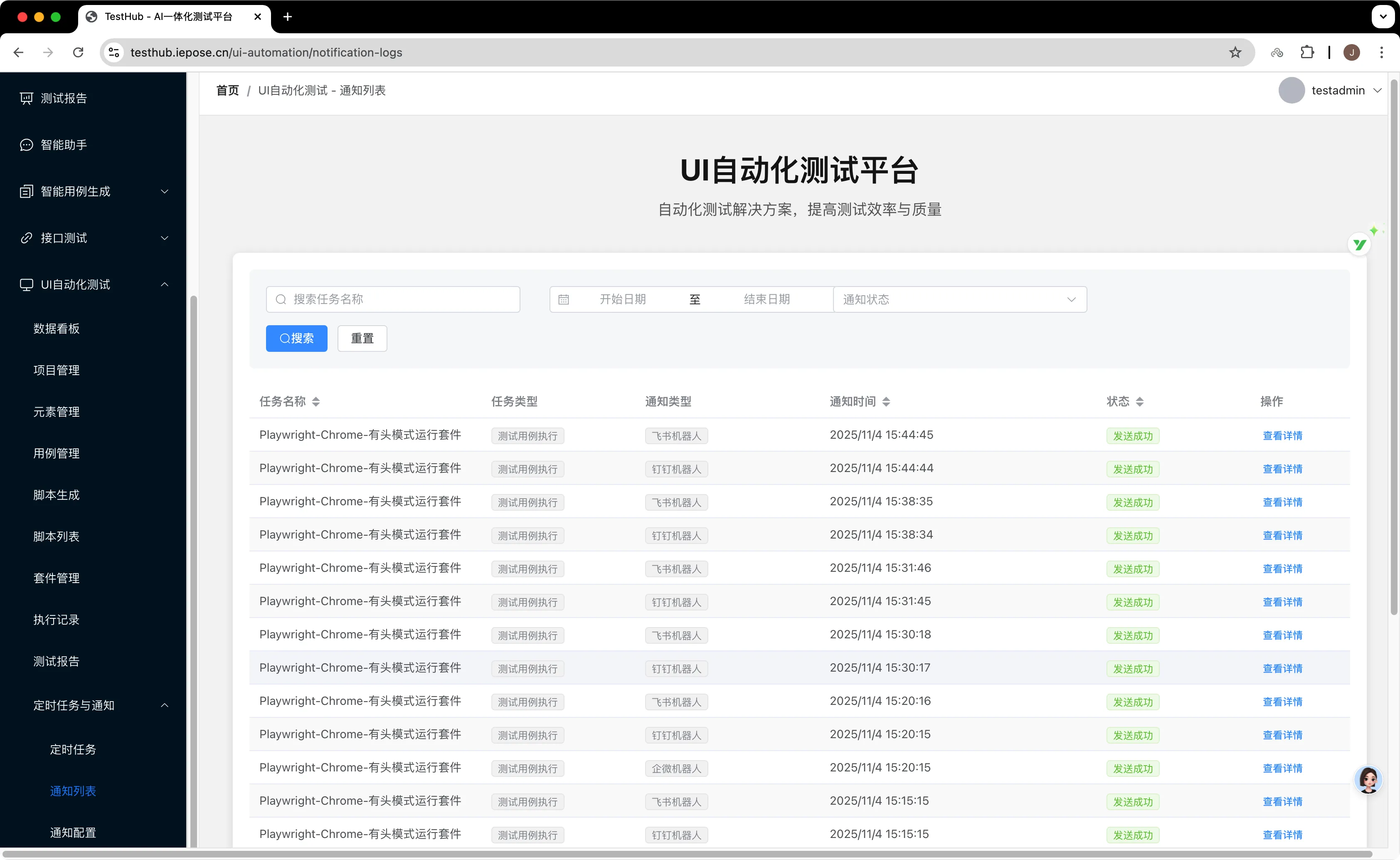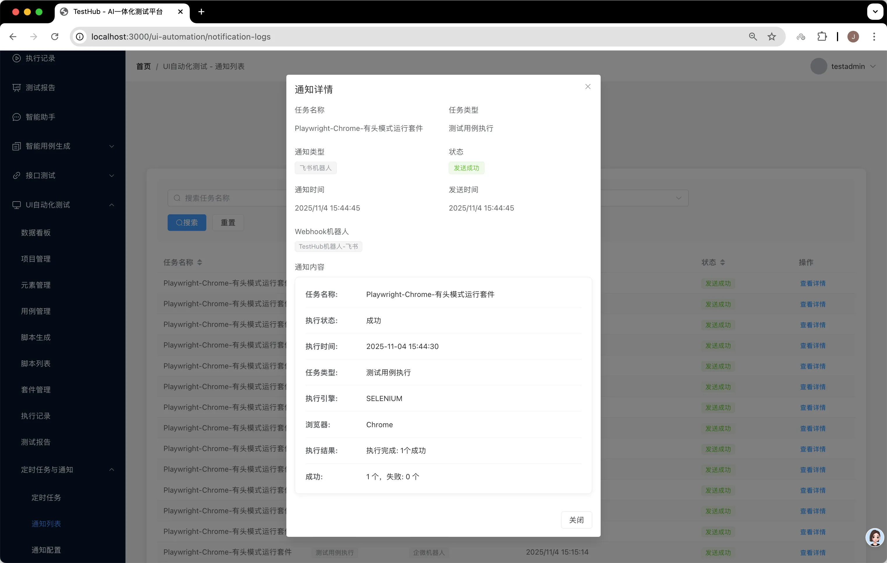 - 通知列表:展示执行成功后发送到各个平台的通知;