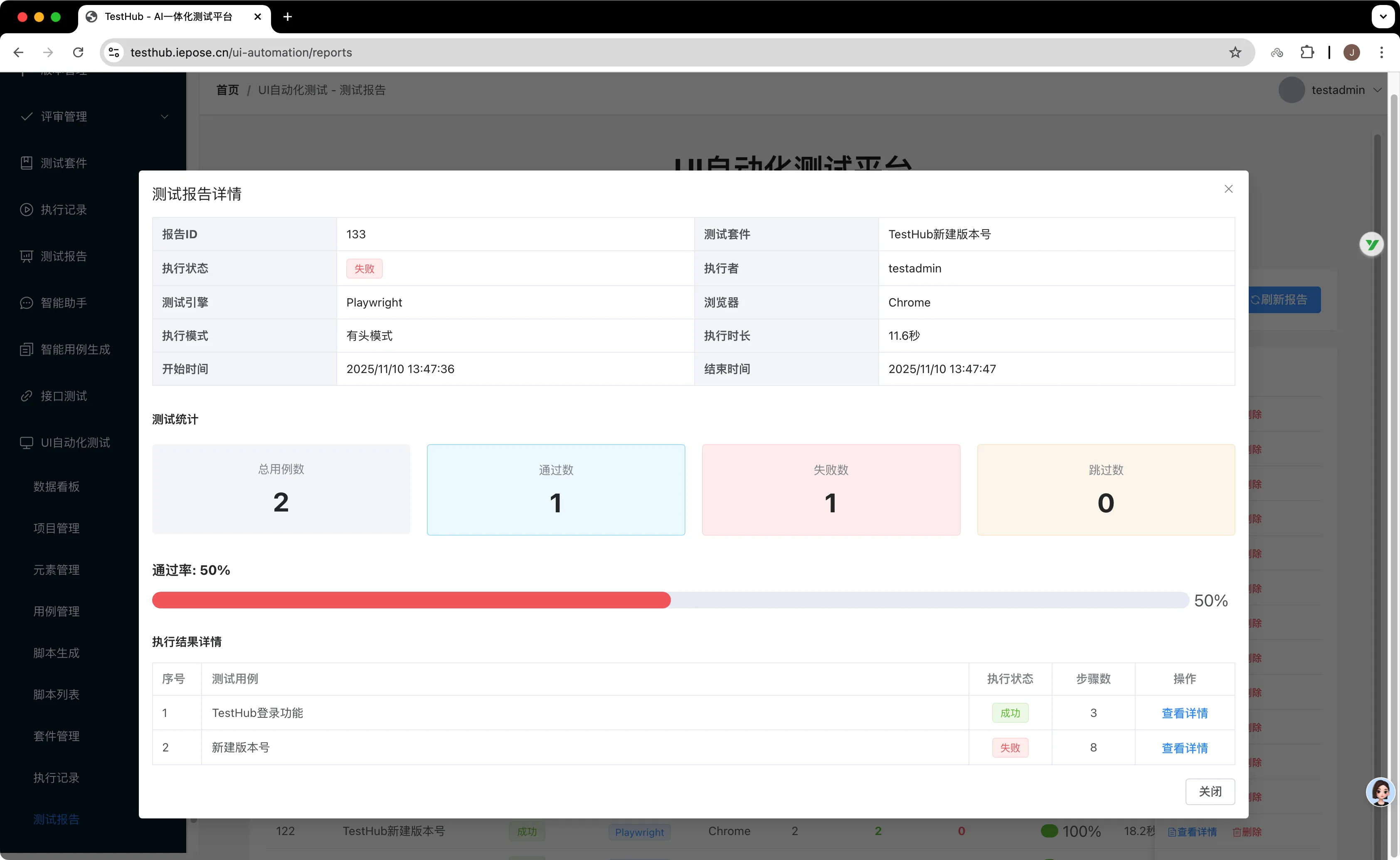 - 执行结果展示具体的执行步骤、失败截图、错误信息;