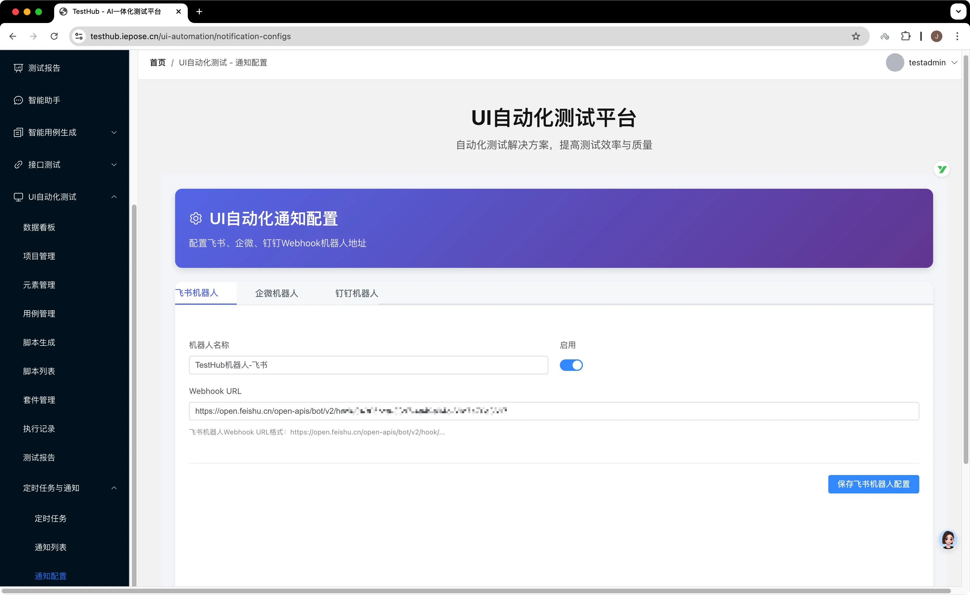 - 通知配置:支持配置多种通知类型,飞书、企微、钉钉。
