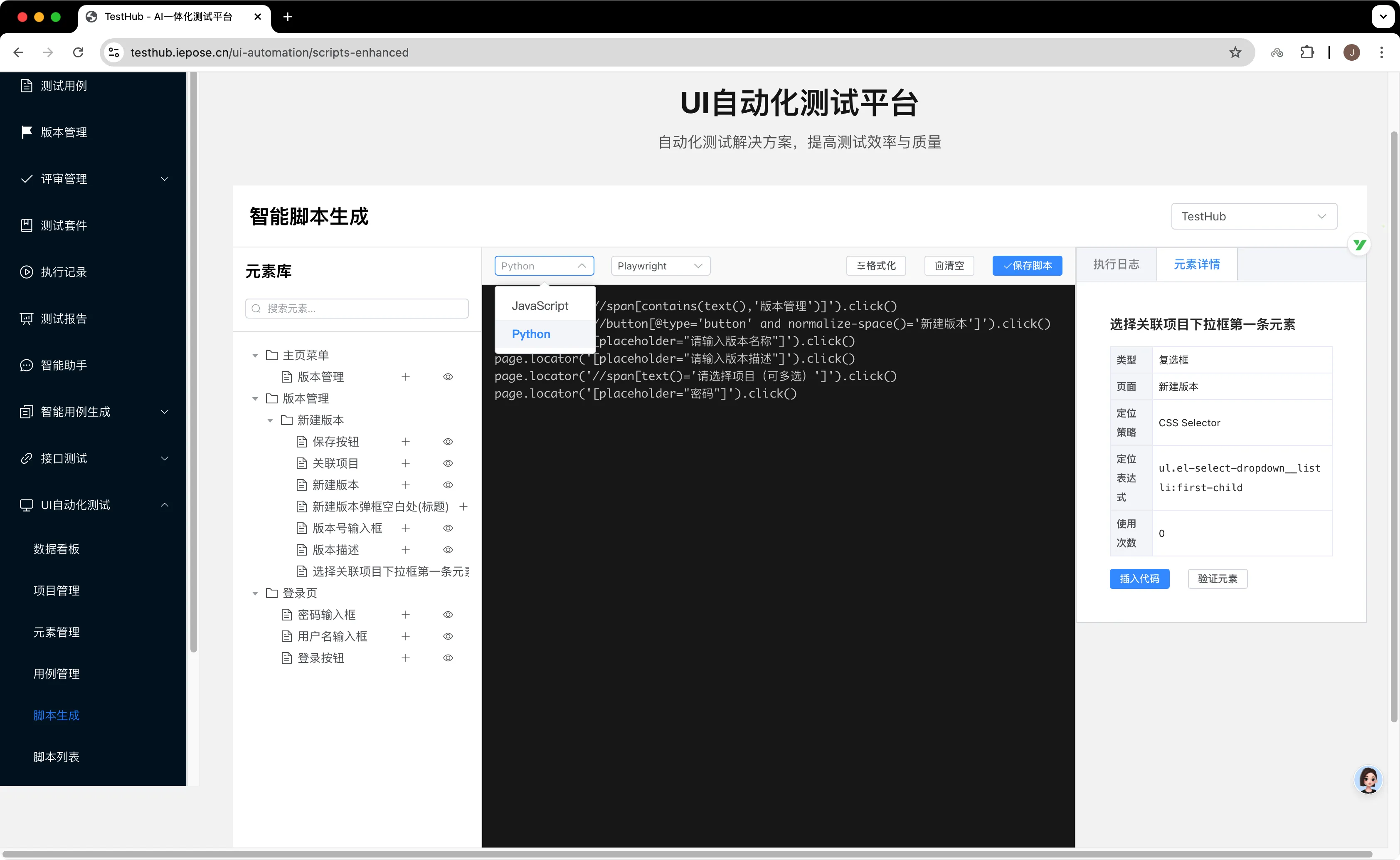 通过添加元素操作,使其生成为直接复制可用的测试脚本,支持Playwright或Selenium,切换不同语言(这块目前稍显鸡肋,后续会考虑如何优化)。