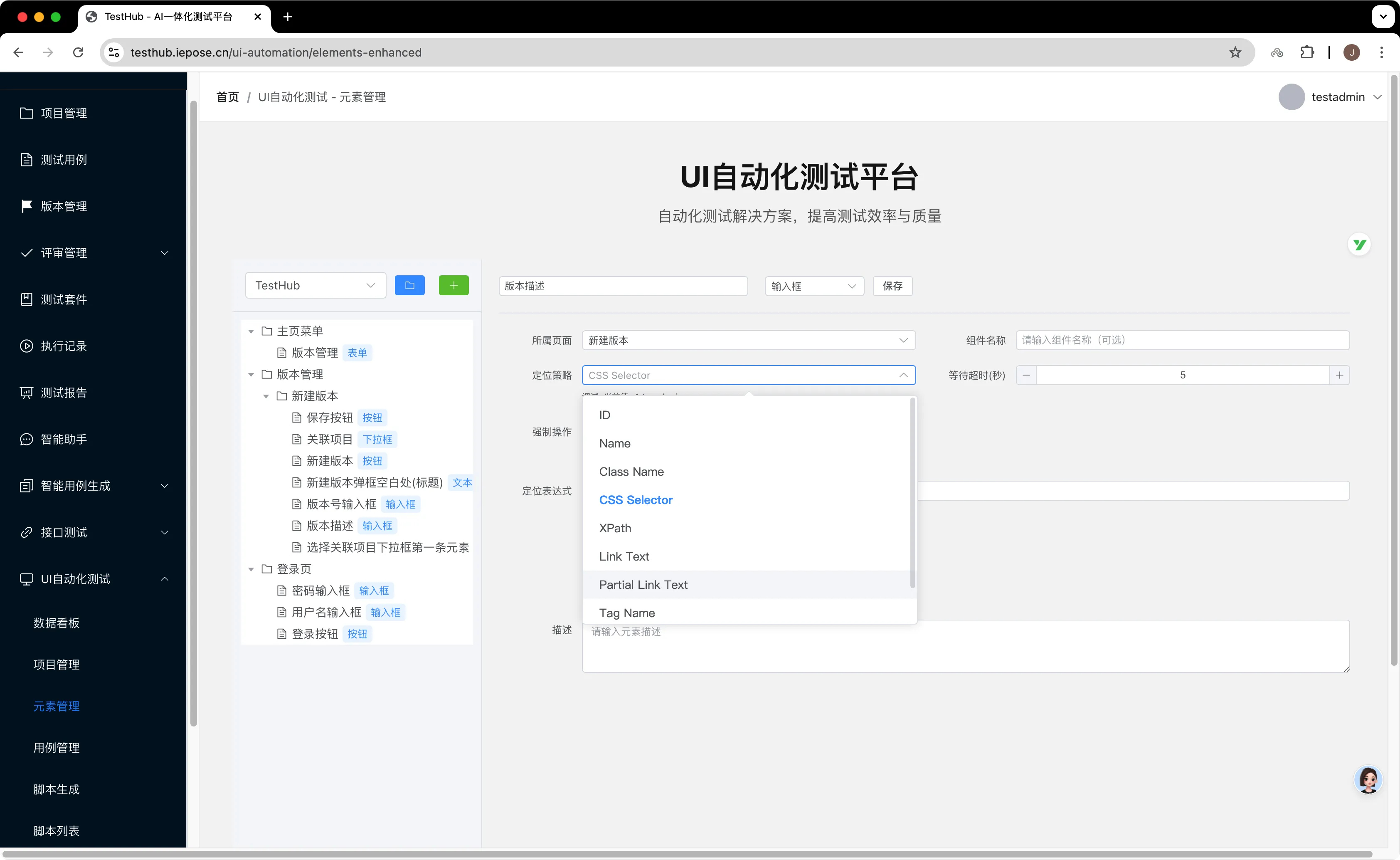 类似于Postman集合(页面)下再创建请求(元素)的组织形式,展示各个页面下的操作按钮、输入框、下拉框等页面元素,支持多种元素定位方式。同时与PageObject的思想不谋而合,元素管理中只关心元素,不关心操作。至于怎么组织元素,那是后面测试用例干的事儿。