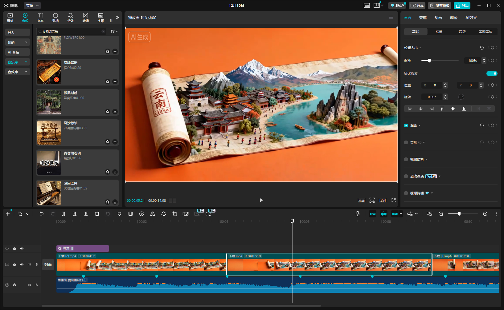 1.打开剪映,导入 AI 生成的动态卷轴视频;
