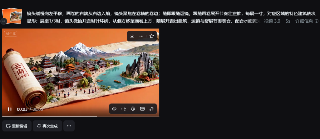 4.点击生成,坐等 2-3 分钟,动态卷轴视频就出炉啦!要是觉得运镜太快 / 太慢,重新生成时加一句 “运镜速度放缓”“运镜节奏加快” 就行~