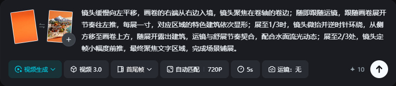 - 首帧上传刚才做的纯背景图,尾帧上传城市卷轴原图;