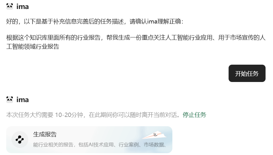 ima会在后台自动进行任务,而且生成好了会通过消息告诉你“你有任务已完成,点击即可查看”