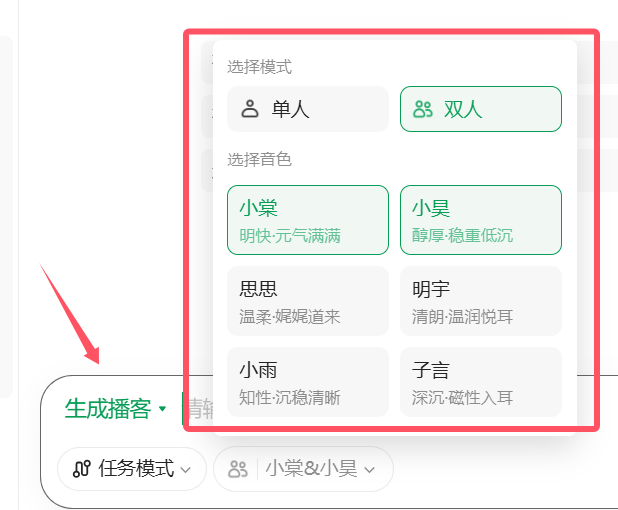 模式:支持“单人”或“双人对话”模式(像聊天节目一样)。