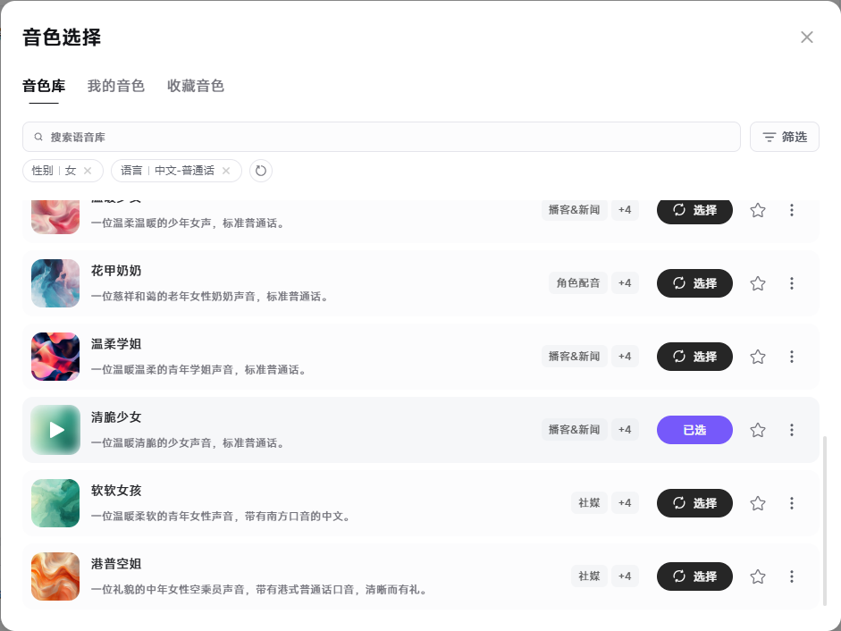 2.音色选择:选择一款女士音色,回到首页,点击生成音频按钮,即可一键生成音频文件,最后下载备用