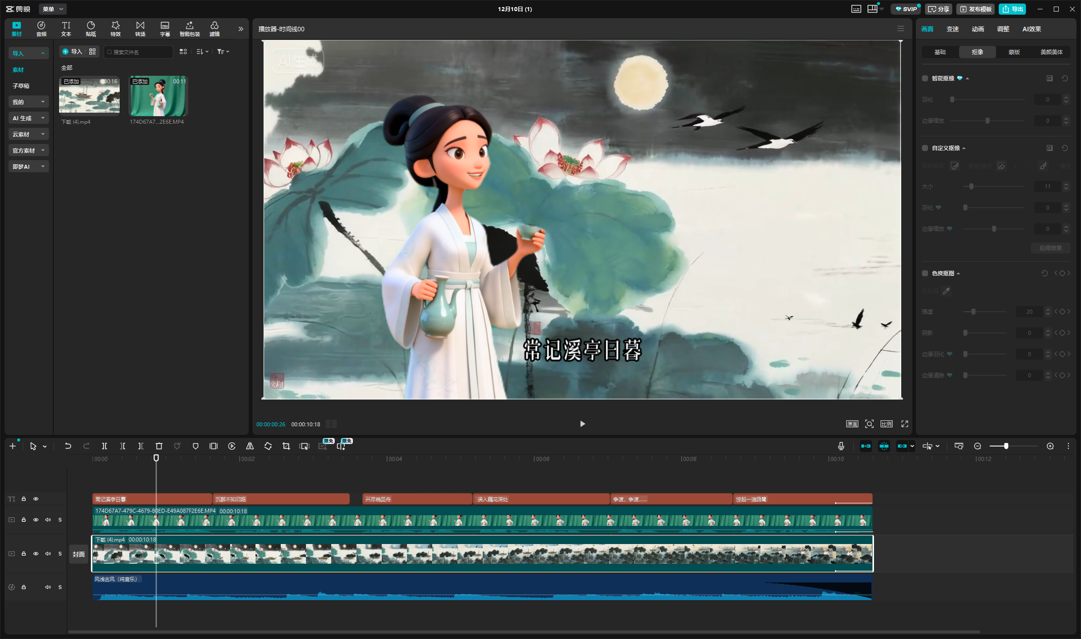 2.先把背景视频拖到轨道,再把人物片段叠在上面,用剪映 “自动抠图” 功能(点击人物片段→抠图→自定义、智能抠图),瞬间把人物从原背景里抠出来,调整大小和位置