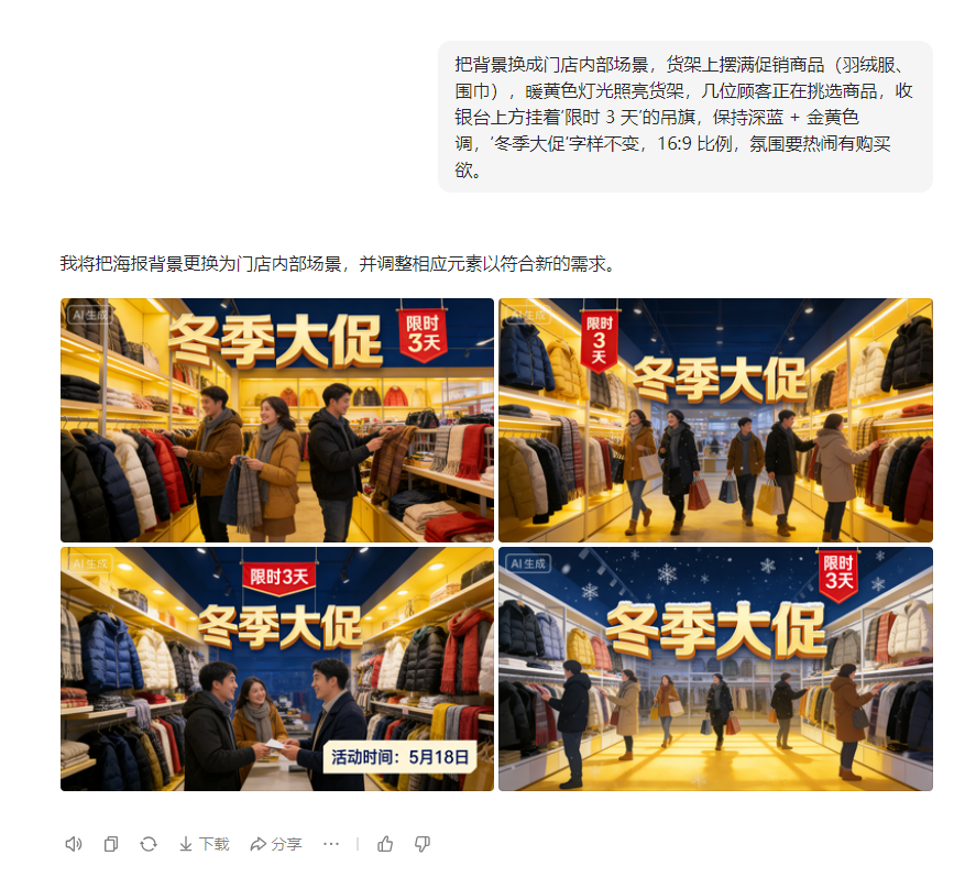 生成效果:背景会精准切换成门店实景,既保留原有色调和核心信息,又更贴近实际宣传场景~