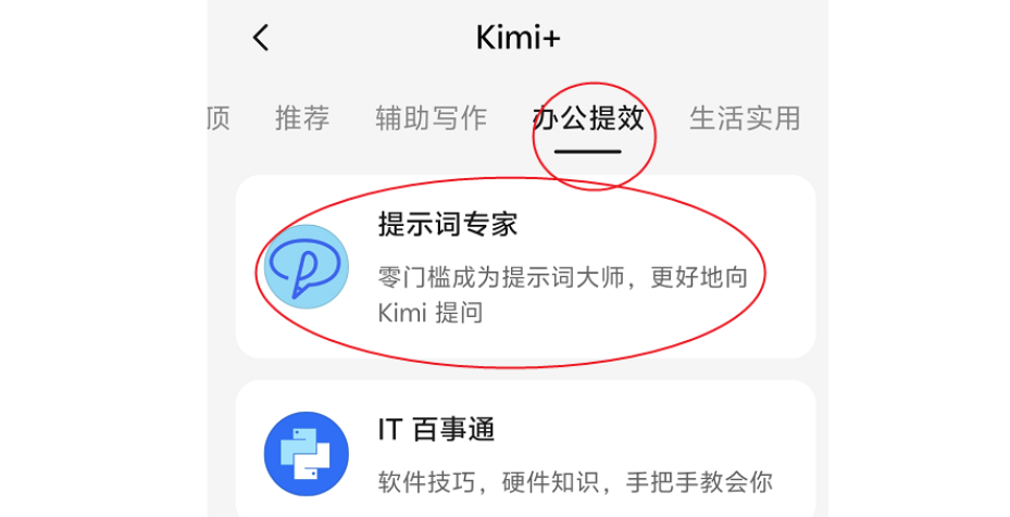 点击左上标志——选择【探索Kimi】——选择【办公提效】——选择【提示词】专家