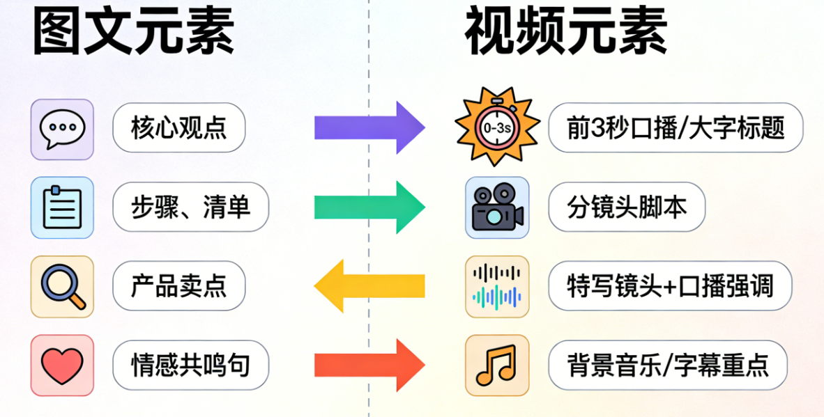 这个步骤的目的是,让AI和你一起提炼出可复用的“爆款公式”。 第二步:根据视频特点进行“元素转换” 图文和视频的表达方式不同。需要把文字元素转换成视频元素。