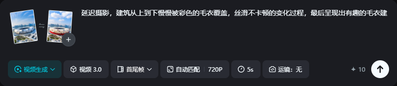 2.首帧上传:建筑原图(没穿毛衣的 “光溜溜” 版本),尾帧上传:刚生成的 “毛衣版” 建筑图