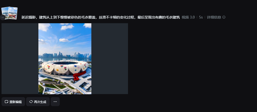 4.点击生成,等 1-2 分钟,建筑 “自动穿毛衣” 的治愈视频就搞定啦!