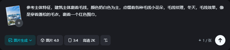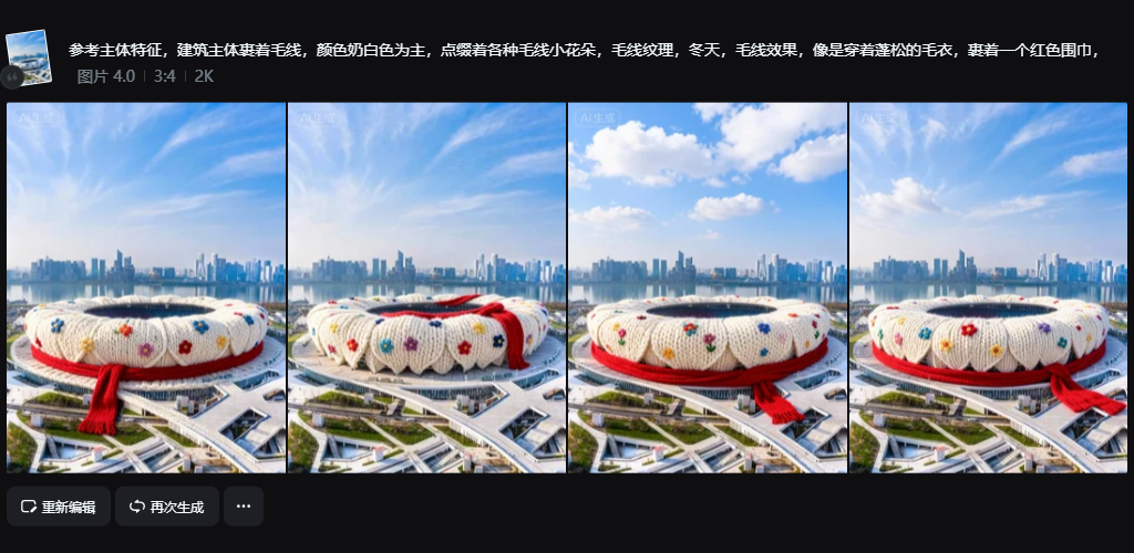 3.点击生成,等10秒左右,建筑的 “毛衣定制款” 就出来啦!要是觉得毛衣不贴合、纹理不清晰,就补一句提示词: