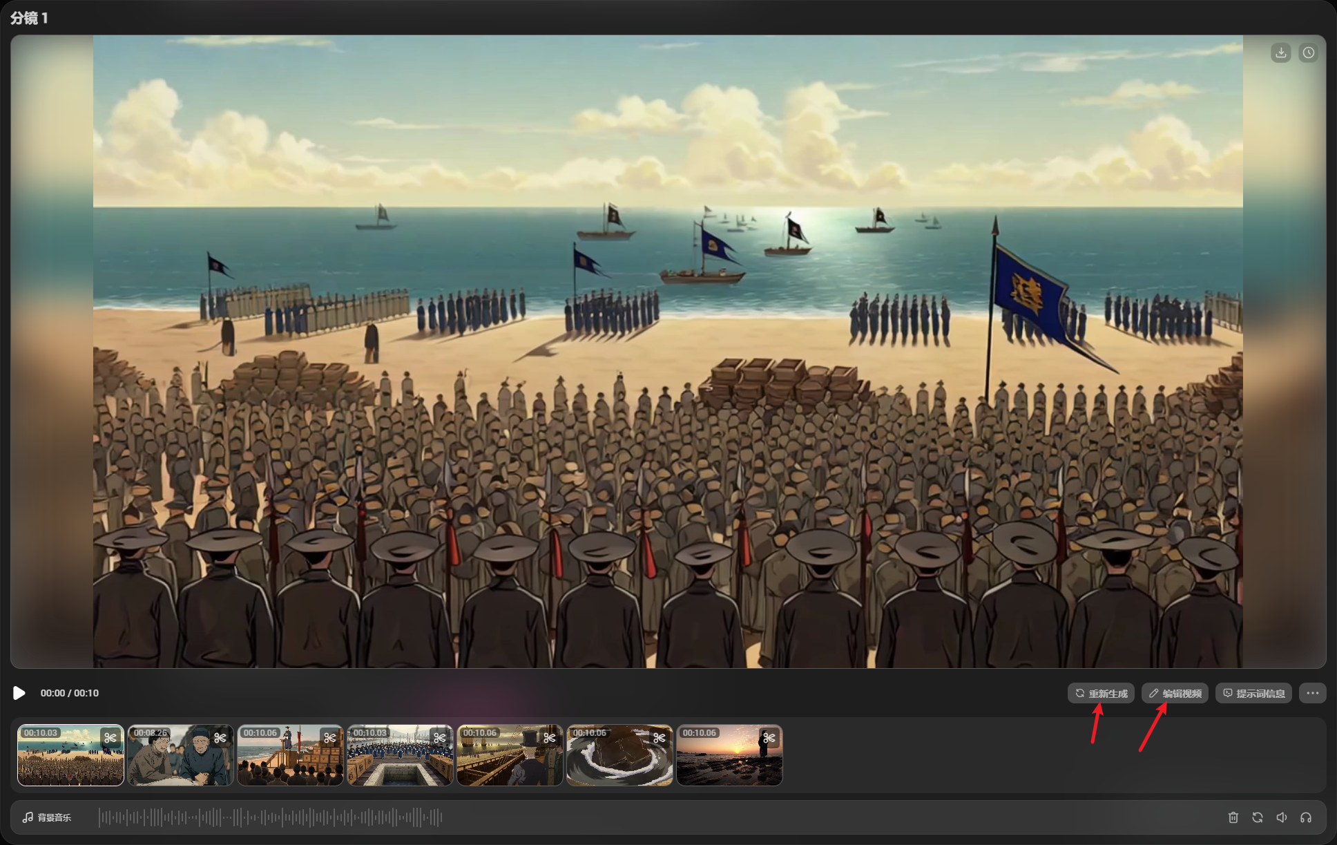 ①生成后可以逐段看,要是某段分镜不满意(比如销烟的浓烟不够逼真),可选中某个视频,点 “重新编辑分镜”,告诉 AI 你的需求,它会立马优化;