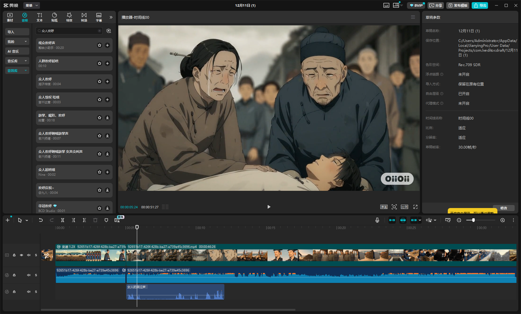 加专属音效:下载成片后,打开剪映,叠加 “海浪声”(虎门海滩场景)、“锁链碰撞声”(查封鸦片)、“百姓欢呼声”(结尾场景),比单纯 BGM 更有沉浸感,剪映里直接搜关键词就能找到;