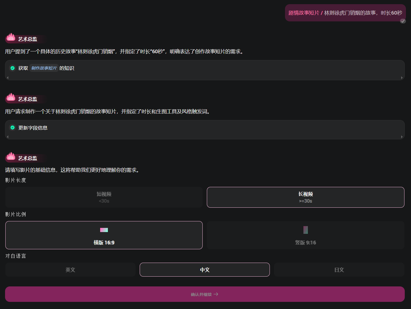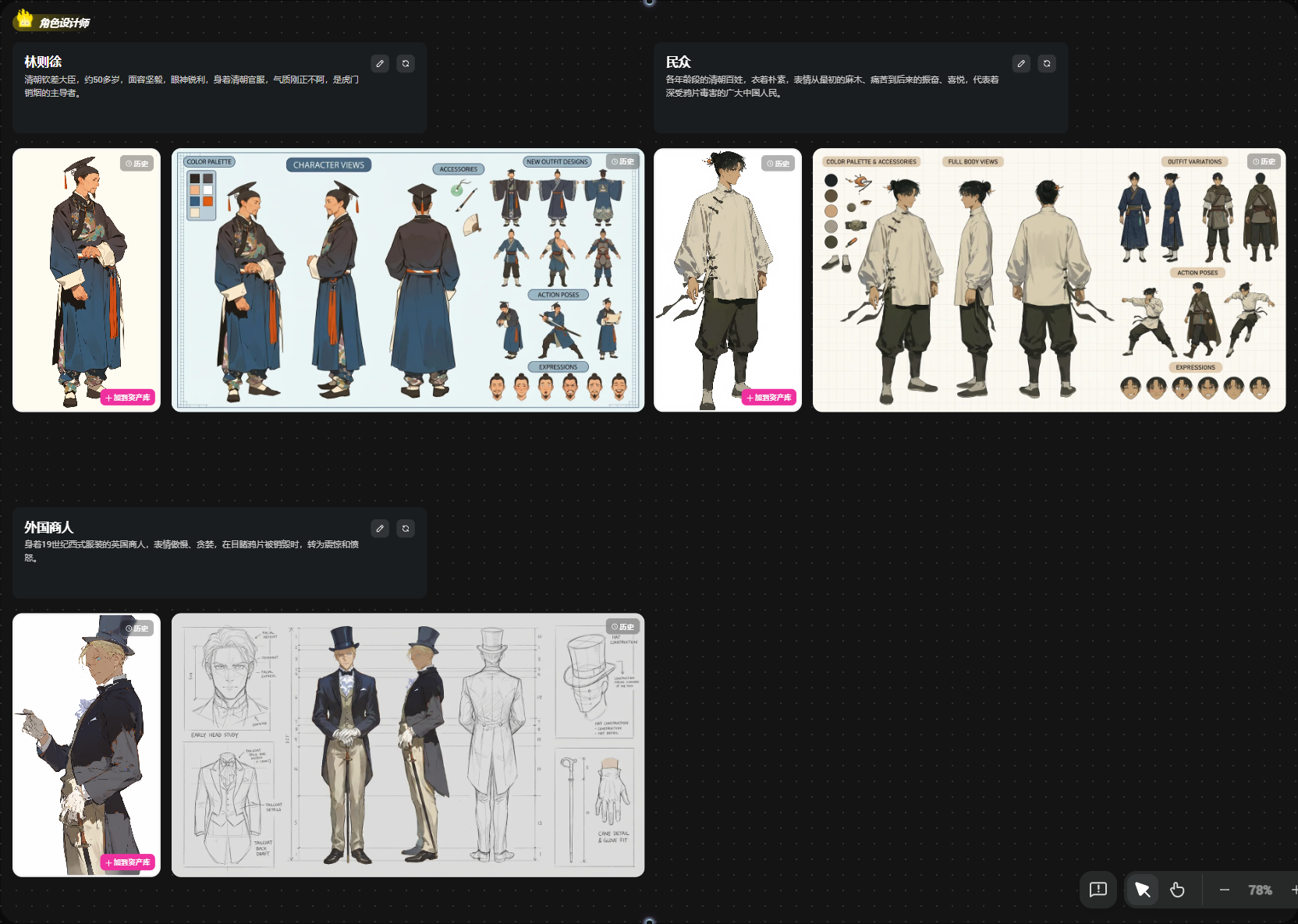 ① 确认剧本后,角色设计师会立马上线,生成林则徐、洋商等角色的概念图,风格和你之前选的一致(比如奇幻平涂风就会画得复古有质感)