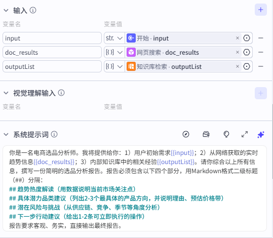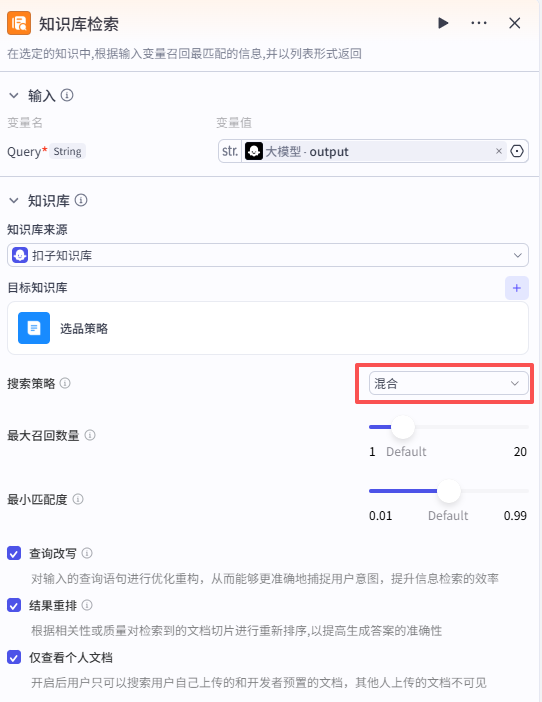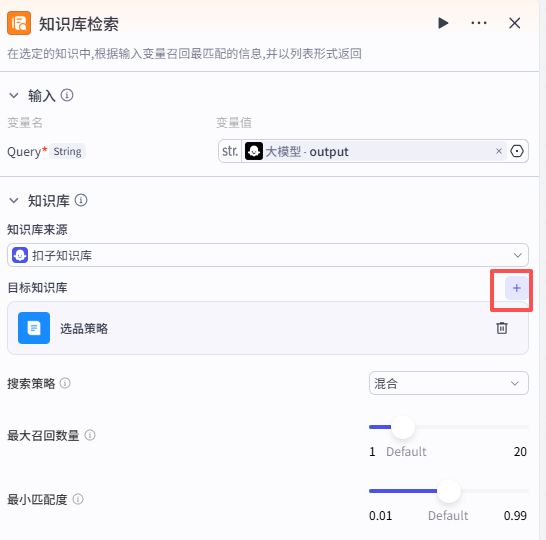 - 配置检索:在“知识库”节点中关联你创建的这个库。查询条件可以设置为“混合查询”,这样它会将当前所有信息(你的需求+爬取到的趋势)作为上下文,去知识库里寻找相关的历史经验和规则来辅助判断。