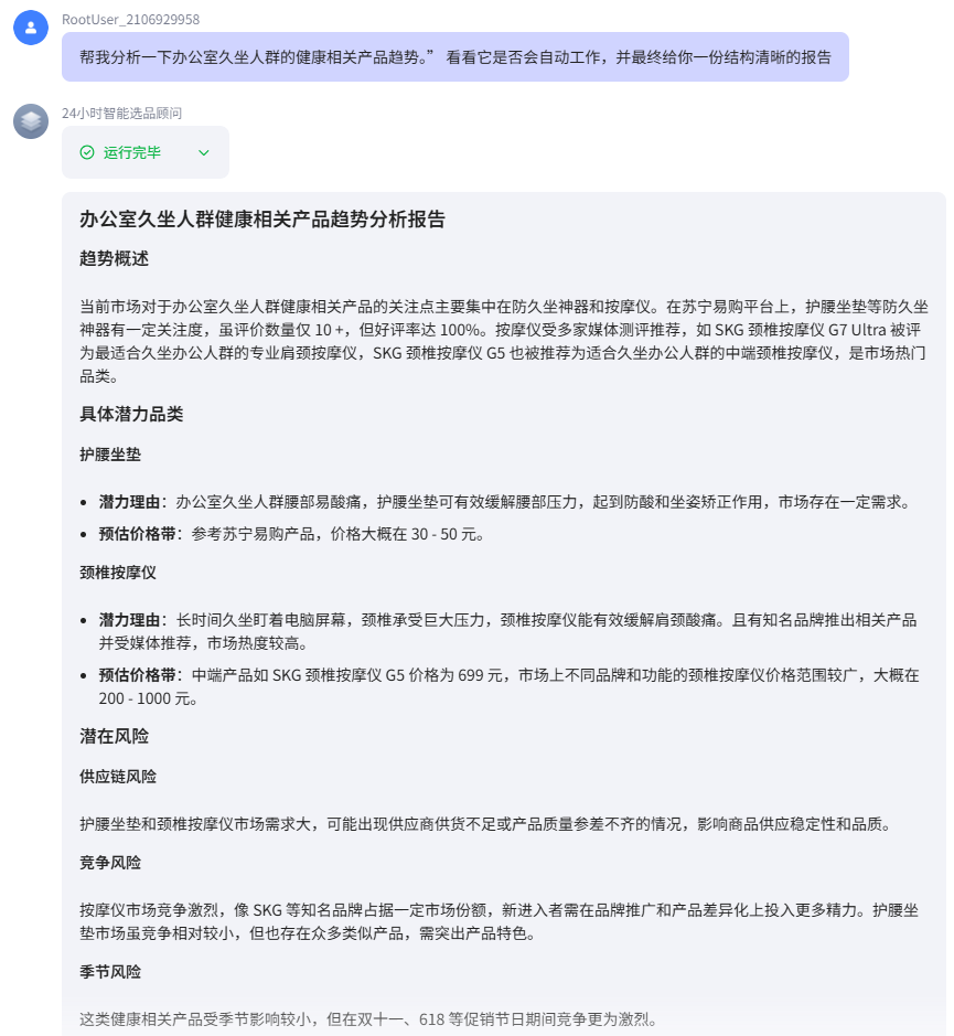 2. 实战测试:在右侧输入框里输入:“帮我分析一下办公室久坐人群的健康相关产品趋势。” 看看它是否会自动工作,并最终给你一份结构清晰的报告。